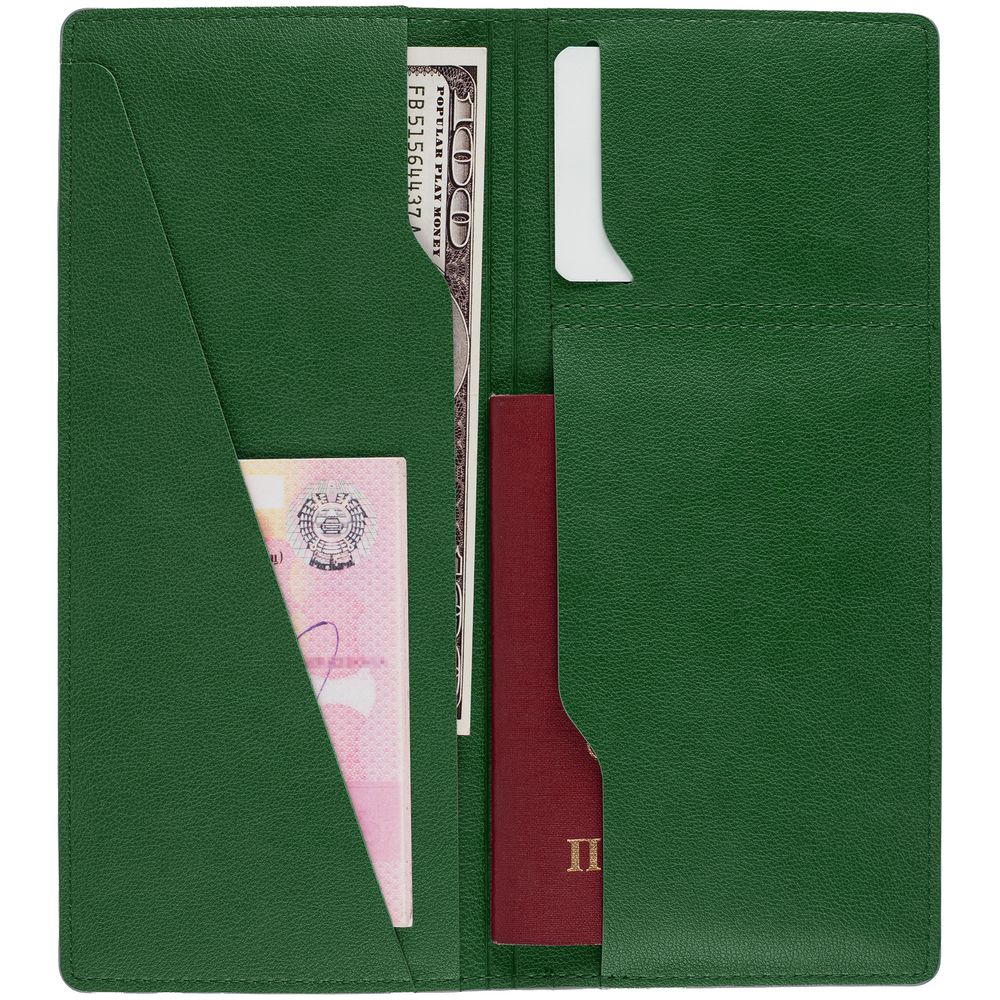 Имеет 5 отделений: для билетов, паспорта, визиток или кредитных карт.