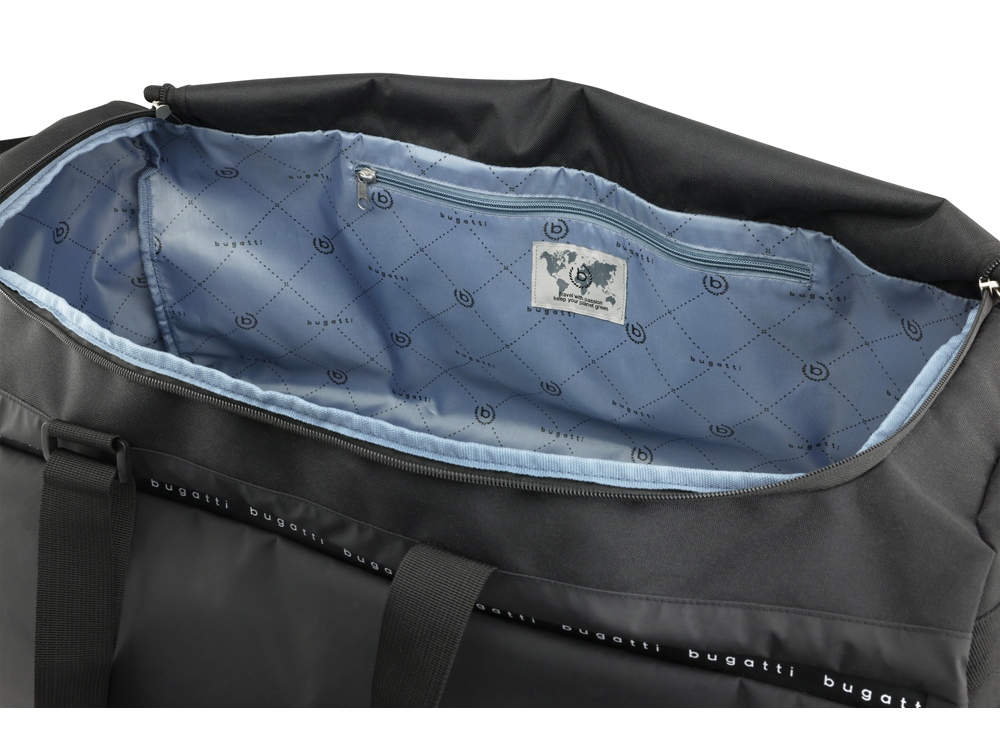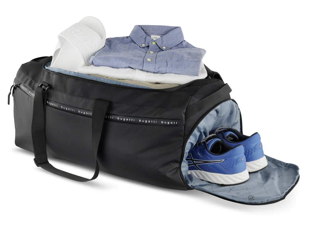 Функциональная организация: основное отделение на молнии с внутренним карманом на молнии, боковое отделение для обуви на молнии, передний карман на молнии, ремень для крепления к телескопической ручке чемодана, 2 боковые ручки, 2 регулируемые ручки, которые можно использовать как плечевые ремни (до 75 см).