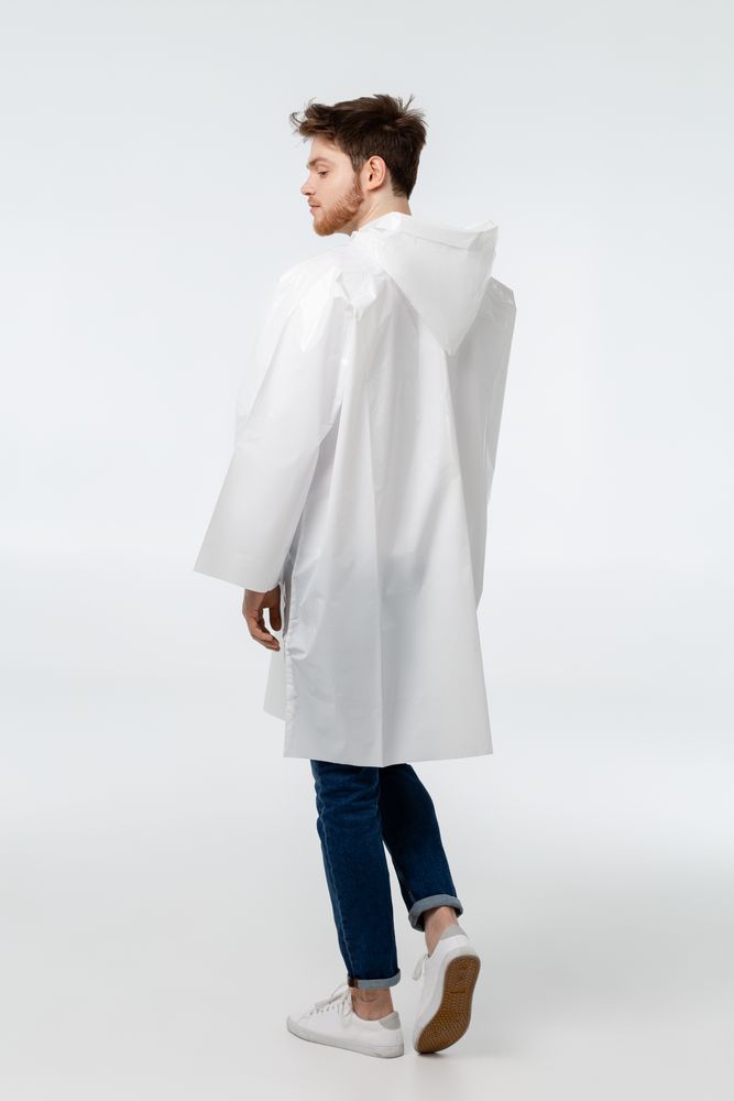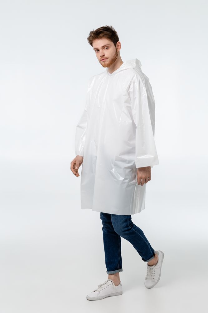 Дождевик-плащ с капюшоном и длинным рукавом из плотного полиэтилена высокого давления (ПВД).- Застегивается на липучку.