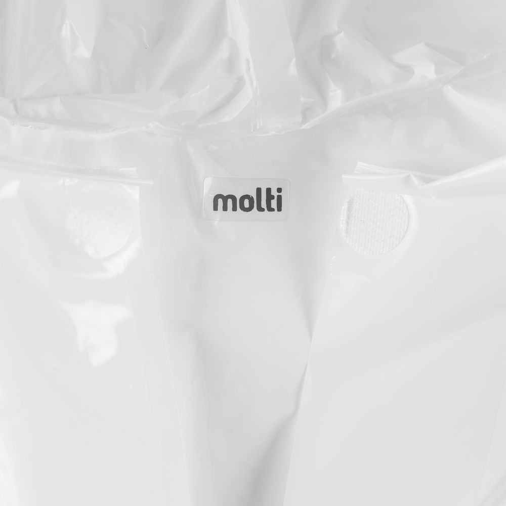 Логотип Molti может быть размещен на дождевике или упаковке. Варианты представлены на фото.Таблица размеров, см Единый размер A 74 B 105 C 90 Допускаются отклонения в 5% от указанных параметров по размеру и цвету