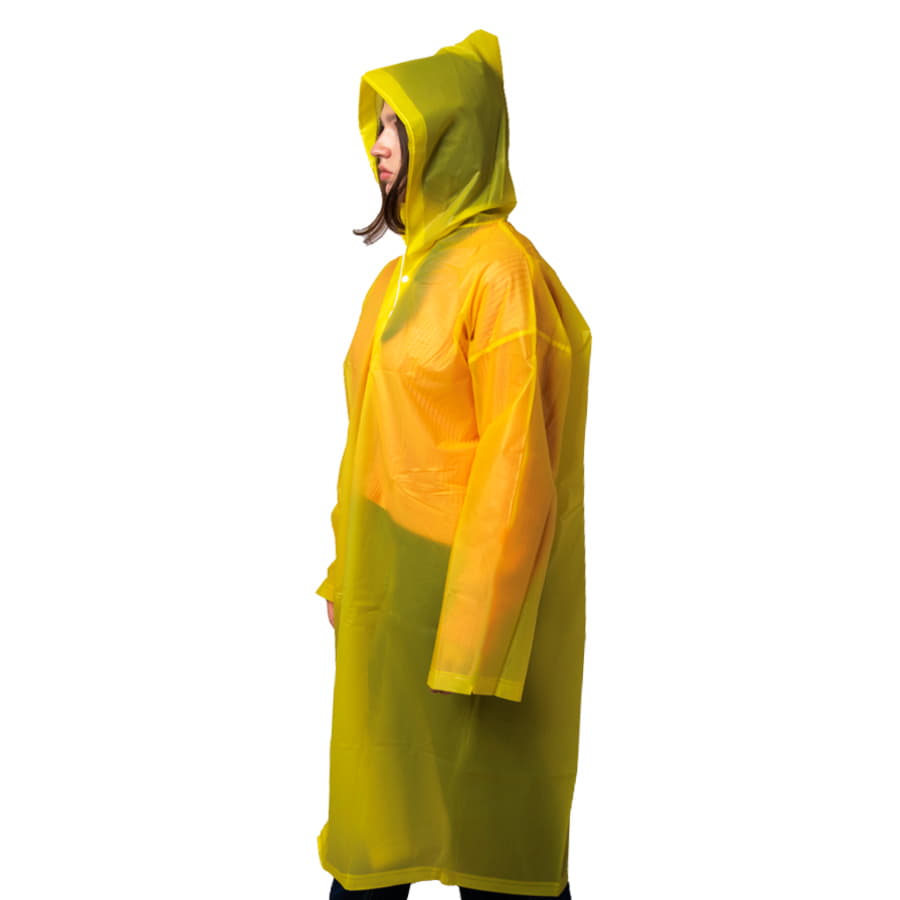 Дождевик "Pure" из непромокаемого материала EVA, толщиной 0,16 мм. Один размер, длина 118 см, ширина под грудью 68 см. Соответствует размеру XL-2XL. Прямой силуэт, втачной рукав, капюшон с завязками. Застёжка на кнопках, капюшон.Цвет близкий к пантону Yellow U. -