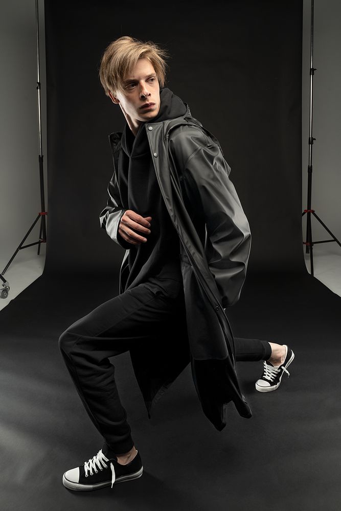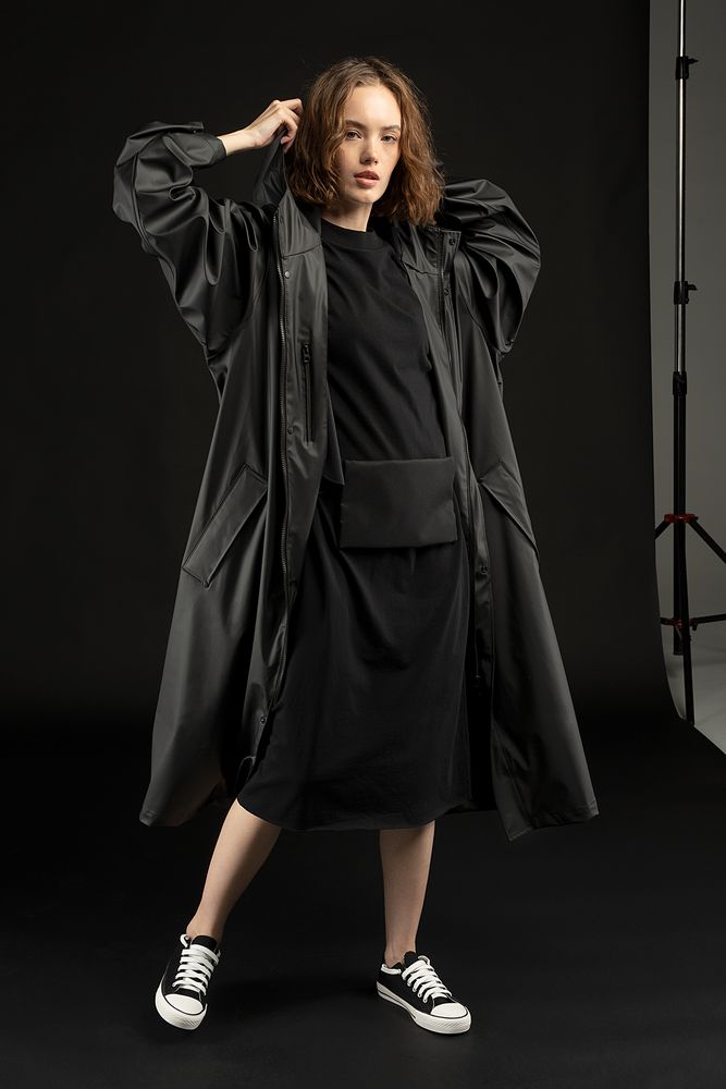 Плащ-дождевик с капюшоном из полиэстера с полиуретановым непромокаемым покрытием.- Абсолютно водостойкие швы благодаря методу спаивания деталей кроя позволяют использовать дождевик даже в шторм