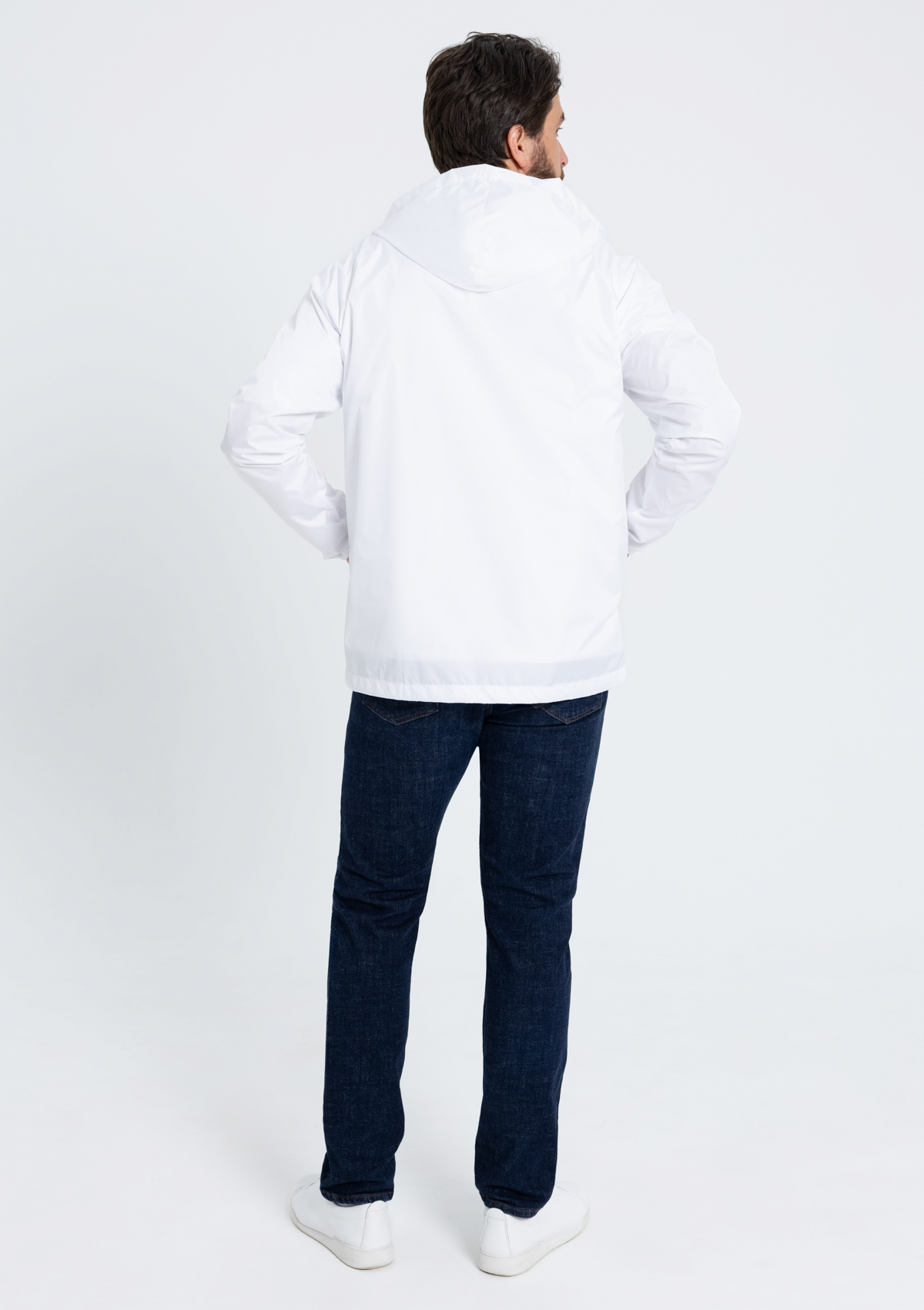 Ветровка прямого силуэта с глубоким капюшоном, спущенной линией плеча, прорезным карманом и застежкой на молнию. Для дополнительной защиты от ветра изделие дополнено эластичной резинкой на рукаве и кулисой по линии низа.