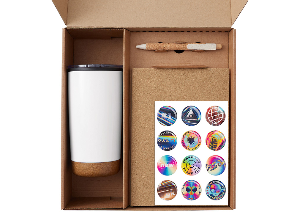 блокнот - пробка, картон, переработанная бумага, ручка - пробка, пластик, дерево, стикеры - смола, коробка - картон