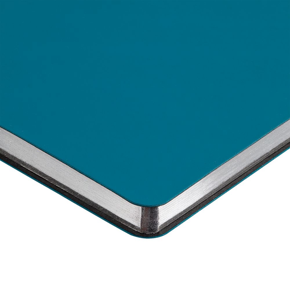 Ежедневник с гибкой обложкой и металлическим корешком, выполнен из материала Soft Touch, цвета морской волны II, дополнен серебристым обрезом блока и ляссе.