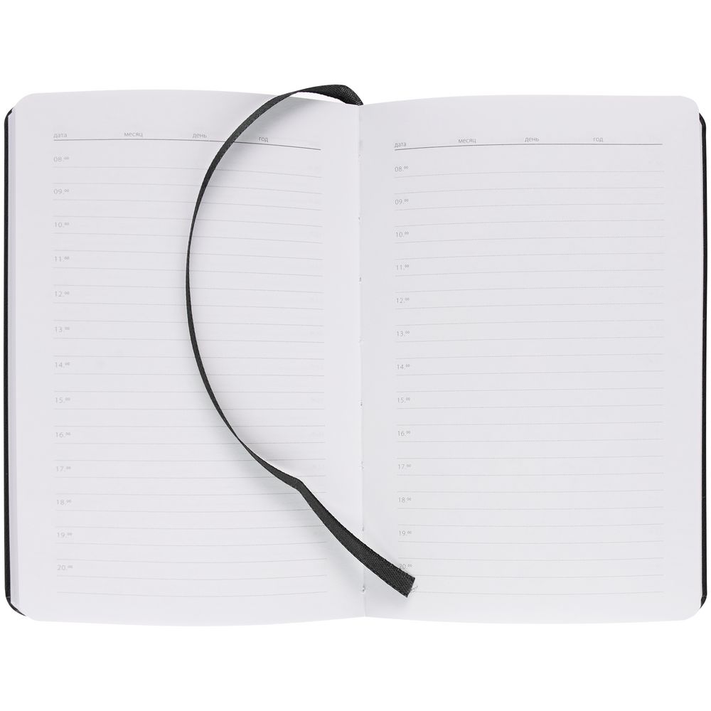 Ежедневник с твердой обложкой, выполнен из материала Latte, черный АА, дополнен ляссе в цвет обложки.