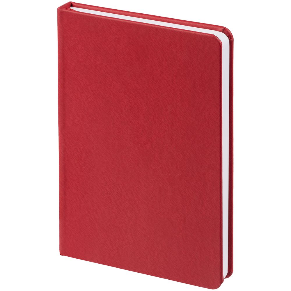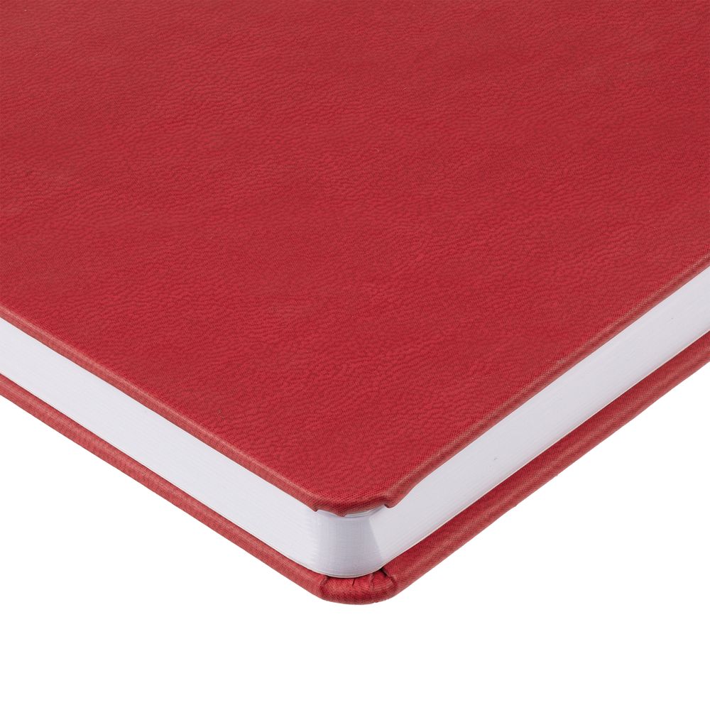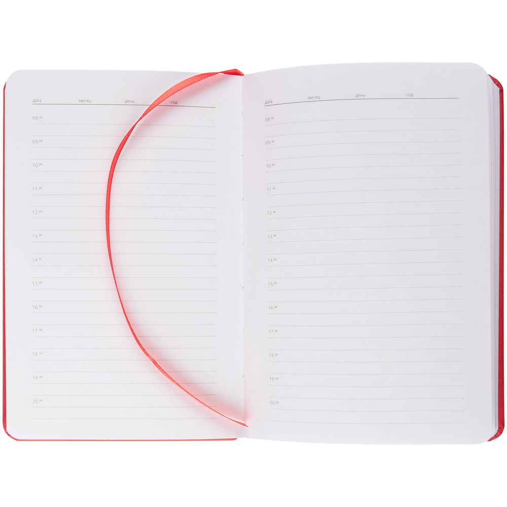 Ежедневник с твердой обложкой, выполнен из материала Latte, красный РР, дополнен ляссе в цвет обложки.