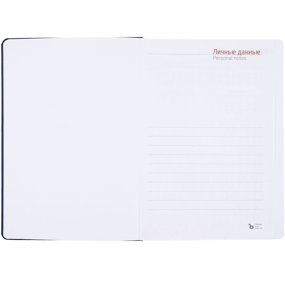 Ежедневник с твердой обложкой, выполнен из материала Latte, темно-синий XX, дополнен ляссе в цвет обложки.Блок 207, с информационным блоком: