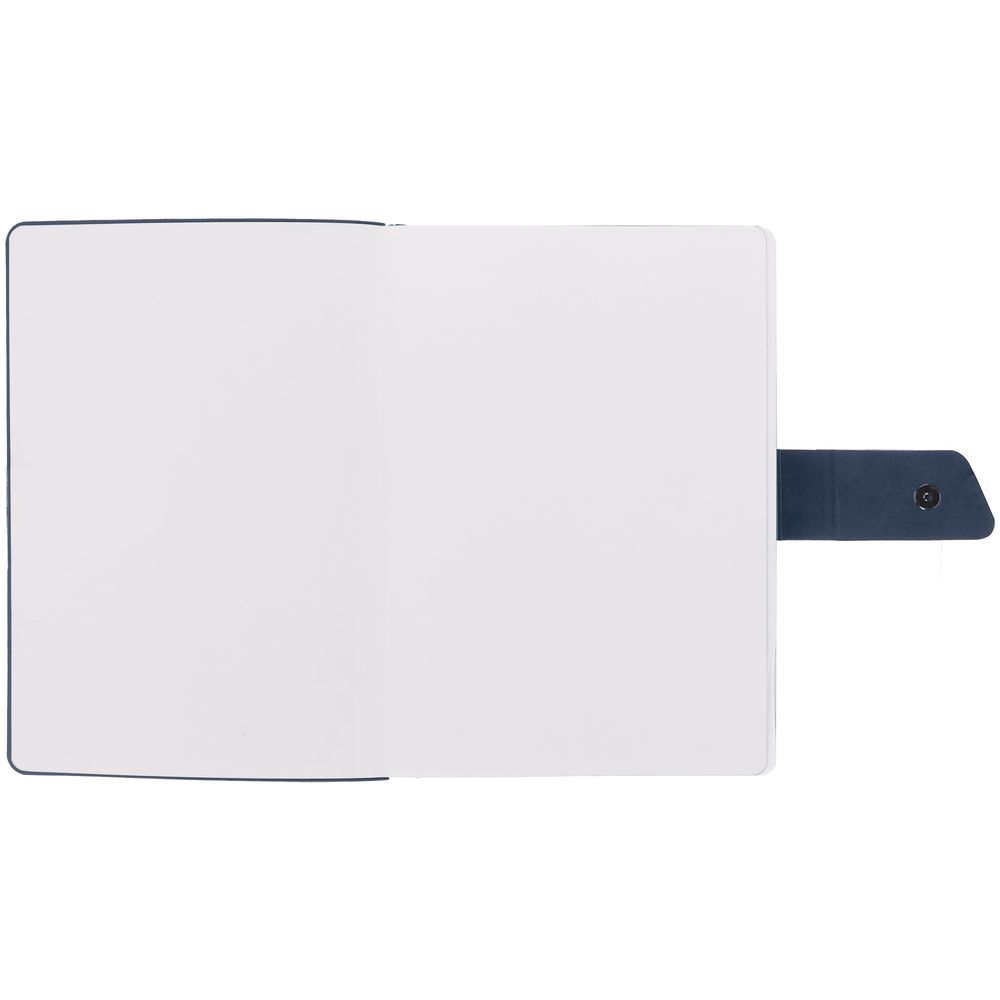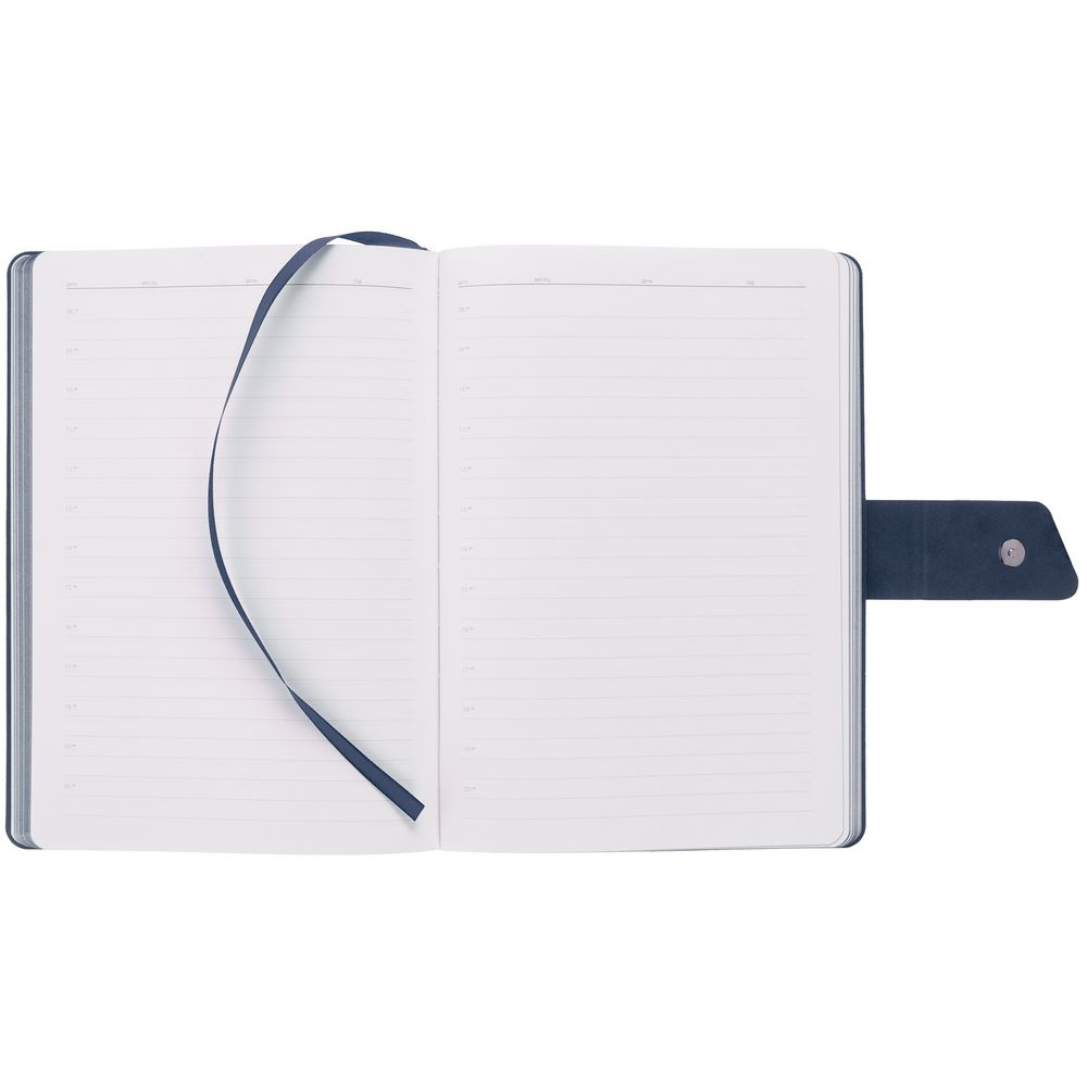 Ежедневник с гибкой обложкой, выполнен из материала La Fite, черный АА и Nubuck, темно-синий ХХ, дополнен синим ляссе и хлястиком на кнопке.