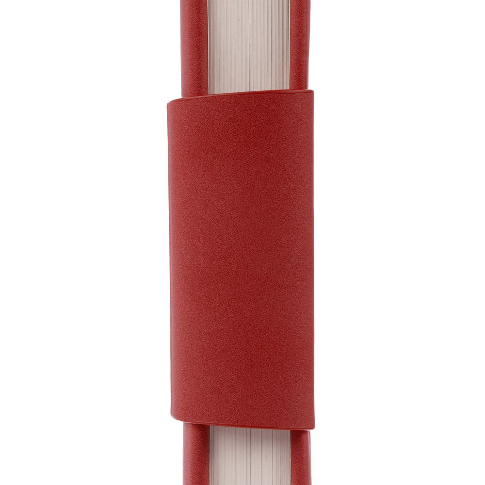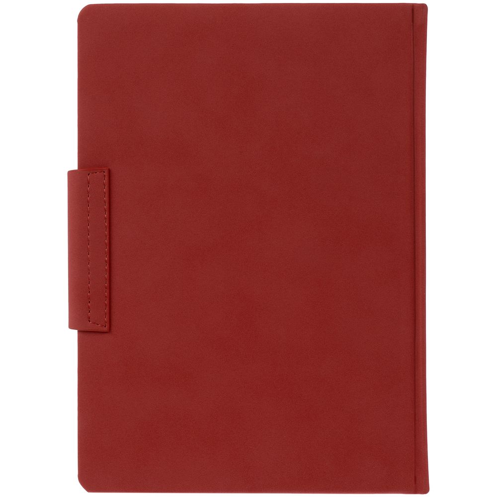 Ежедневник с твердой обложкой c поролоном, выполнен из материала Nubuck, красный РР, дополнен капталом и ляссе в цвет обложки. Застежка — хлястик на магните.