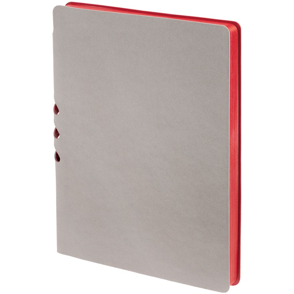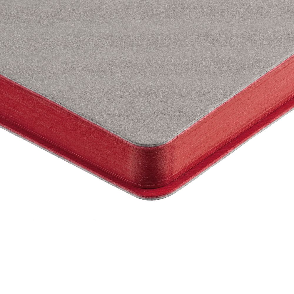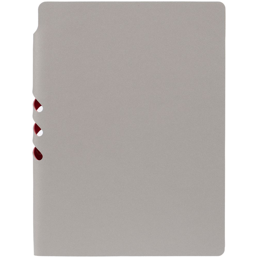 Гибкая обложка выполнена из материала Velour Melange, серый СС и Latte, красный PP (внутренняя часть обложки). Внутри корешка — специальное место для крепления ручки размером до 15х0,9 см.
