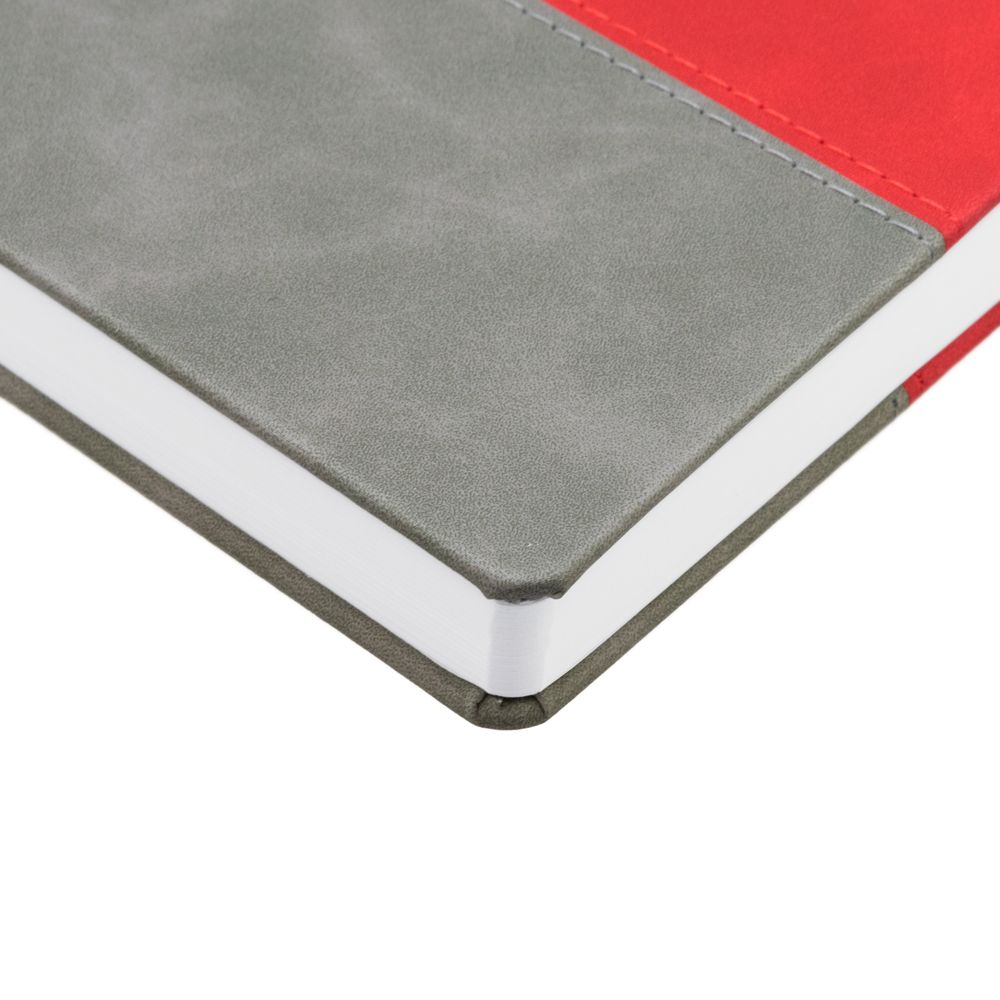 Ежедневник с твердой обложкой, без поролона, со сшивкой материалов Nubuck Touch, серый СС, и Nubuck Touch красный РР, дополнен двойным ляссе и петлей-резинкой для ручки.