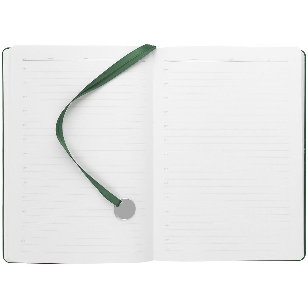 Ежедневник с гибкой обложкой, выполнен из материала La Fite, зеленый, дополнен ляссе в цвет обложки с металлическим шильдом.Блок 985, без календарной сетки и информационного блока: