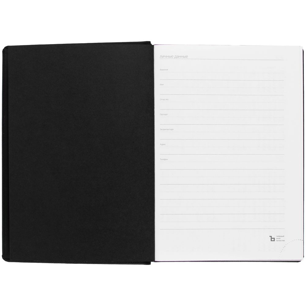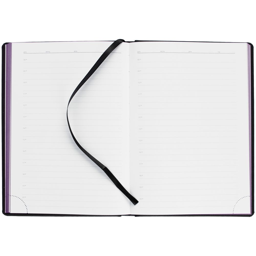 Твердая обложка выполнена из материалов Nice Touch, черный АА, и Canyon, фиолетовый UU. Ежедневник дополнен капталом, резинкой для ручки и ляссе черного цвета.Блок 922, с информационным блоком: