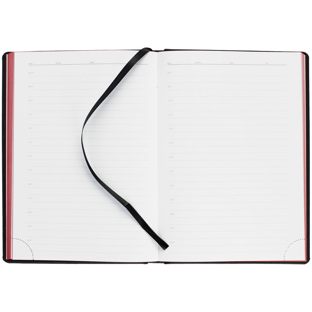 Твердая обложка выполнена из материалов Nice Touch, черный АА, и Canyon, красный РР. Ежедневник дополнен капталом, резинкой для ручки и ляссе черного цвета.