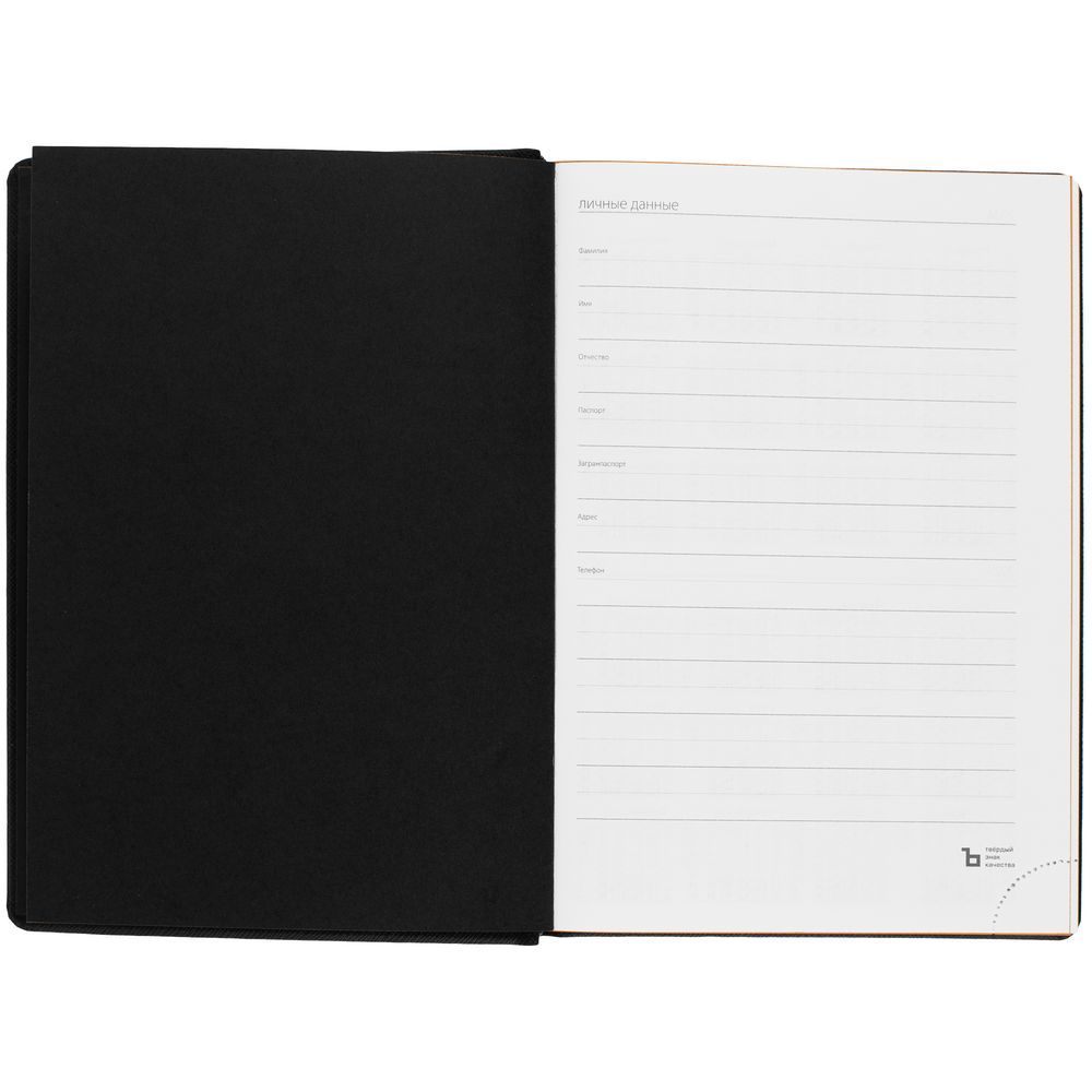 Твердая обложка выполнена из материалов Nice Touch, черный АА, и Canyon, оранжевый ОО. Ежедневник дополнен капталом, резинкой для ручки и ляссе черного цвета.Блок 922, с информационным блоком:
