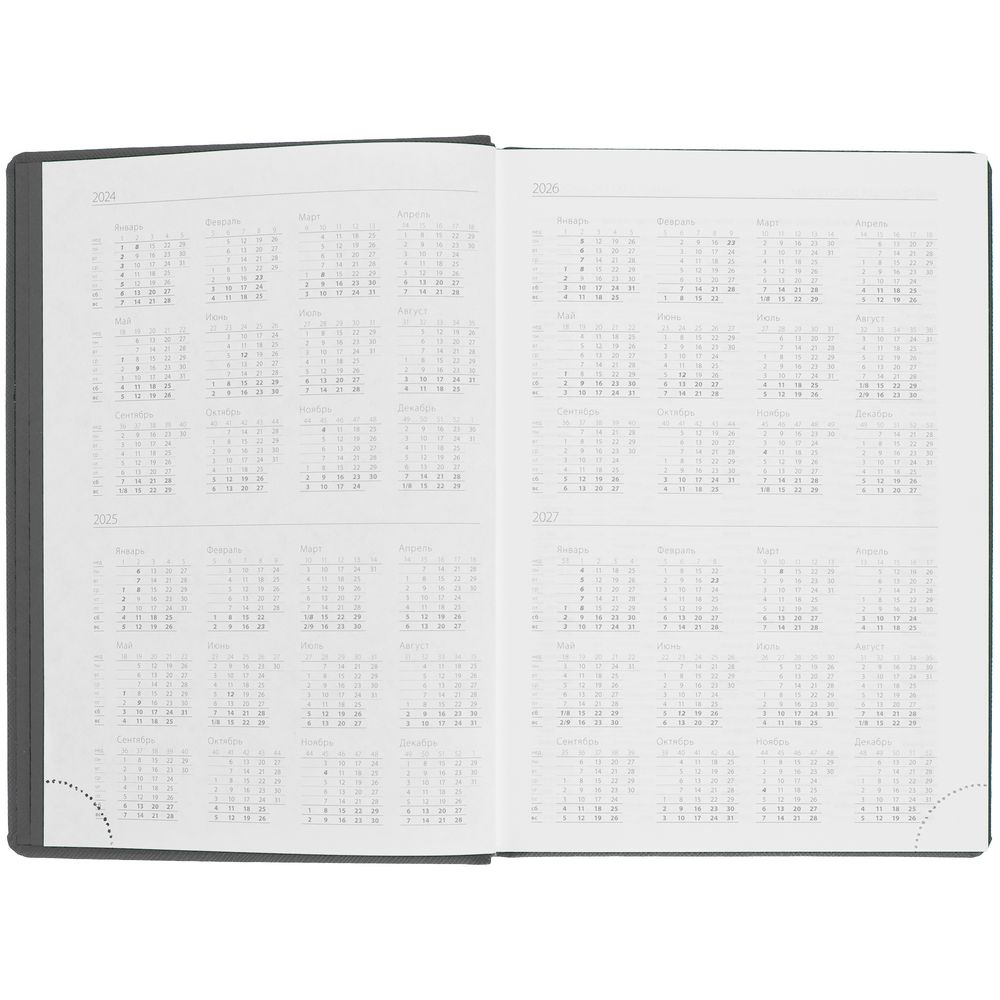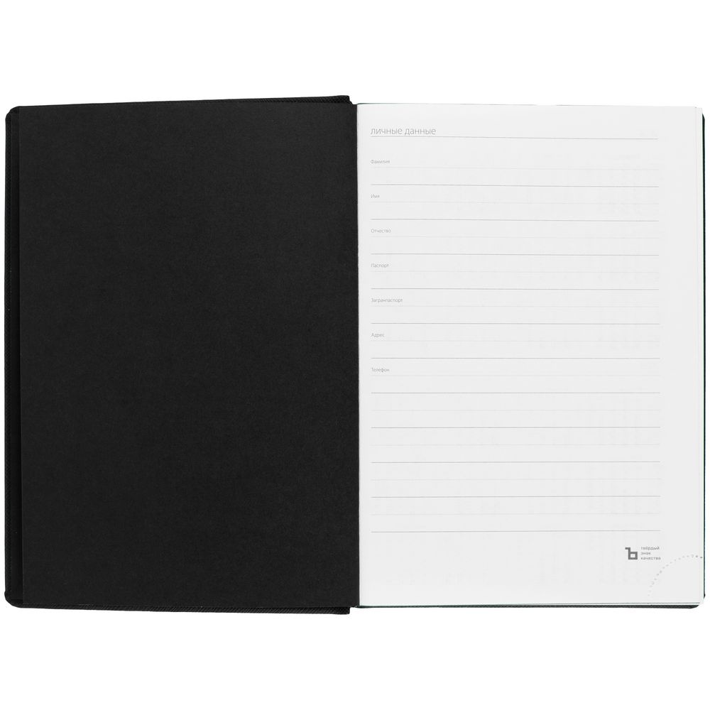 Твердая обложка выполнена из материалов Nice Touch, черный АА, и Canyon, зеленый FF. Ежедневник дополнен капталом, резинкой для ручки и ляссе черного цвета.Блок 922, с информационным блоком: