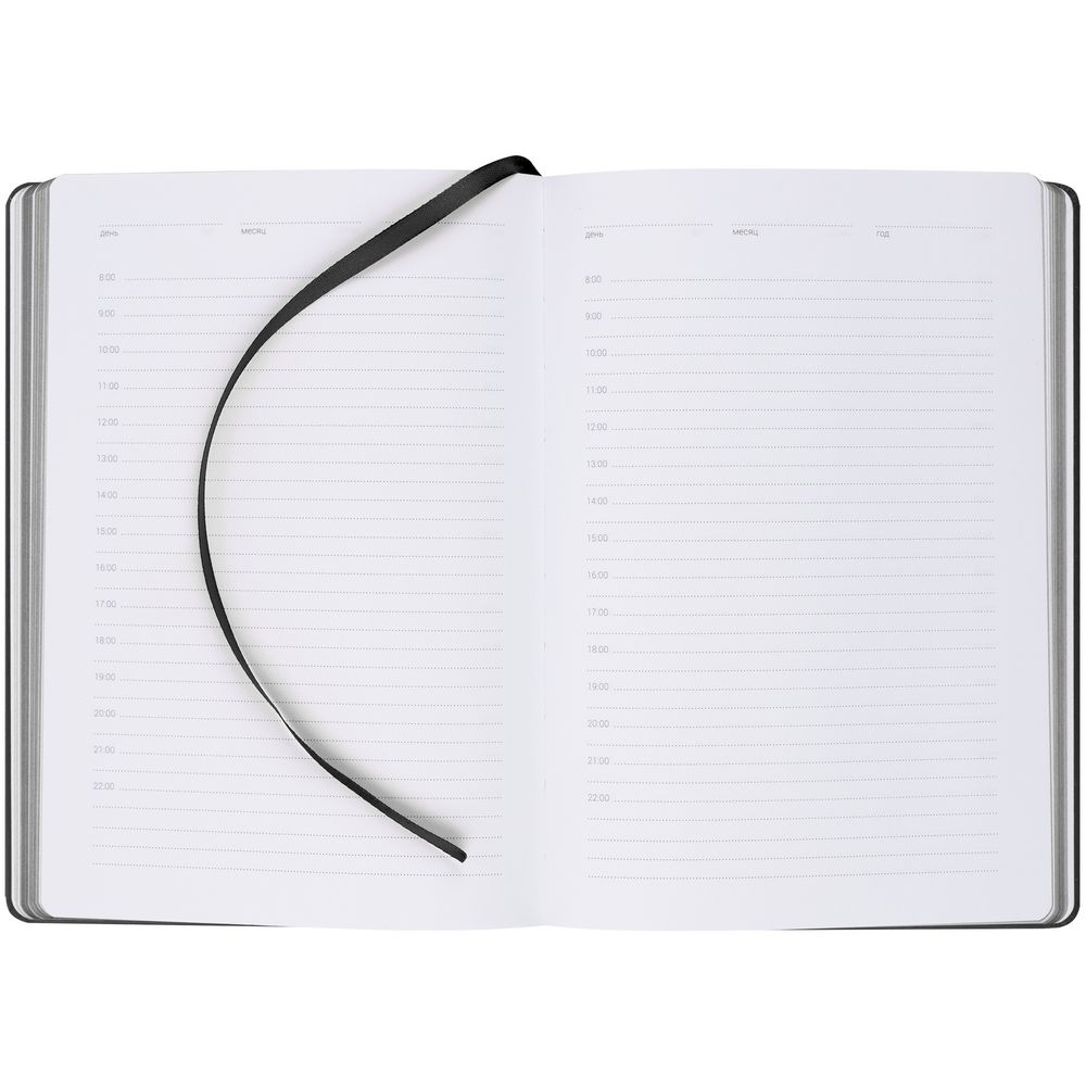 Ежедневник с твердой обложкой, выполнен из материала Latte, черный АА, обрез черного цвета, дополнен ляссе черного цвета и резинкой с металлическим шильдом.