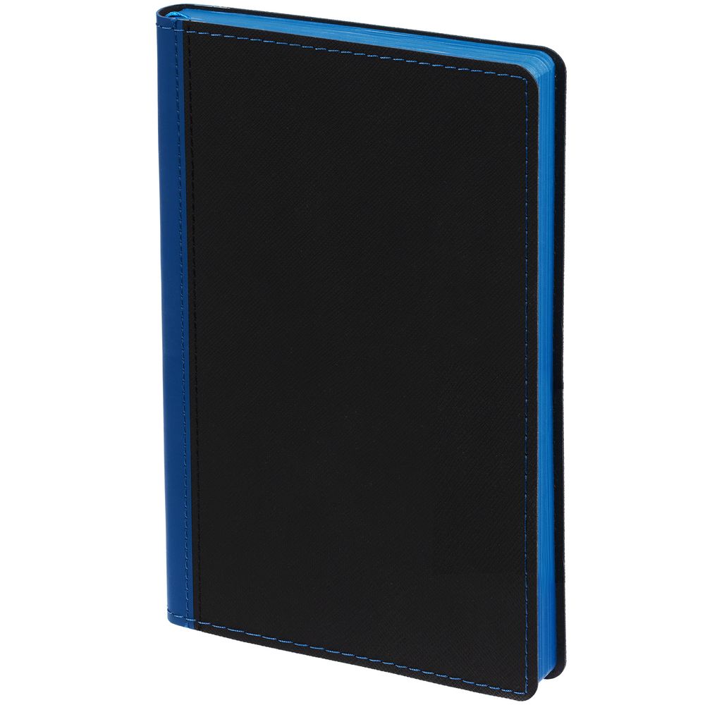 Стильный двухцветный ежедневник с гибкой обложкой и цветным обрезом.Ежедневник с гибкой обложкой выполнен из материала Nice Touch, черный АА и Soft Touch Ultra, синий НН, дополнен ляссе гсинего цвета.