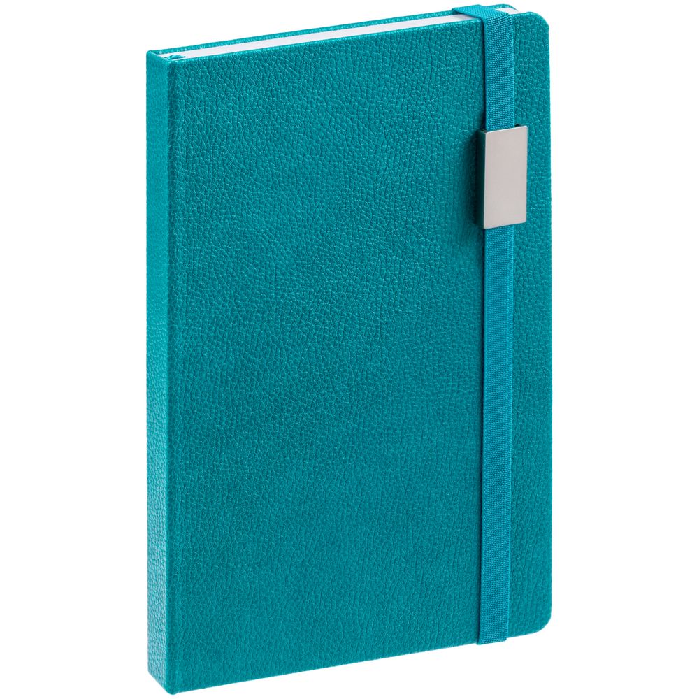 Зауженный ежедневник с прямоугольным металлическим шильдом на резинке.Ежедневник с твердой обложкой, выполнен из материала LaFite, цвет морской волны II, дополнен резинкой с металлическим прямоугольным шильдом и ляссе в цвет обложки.