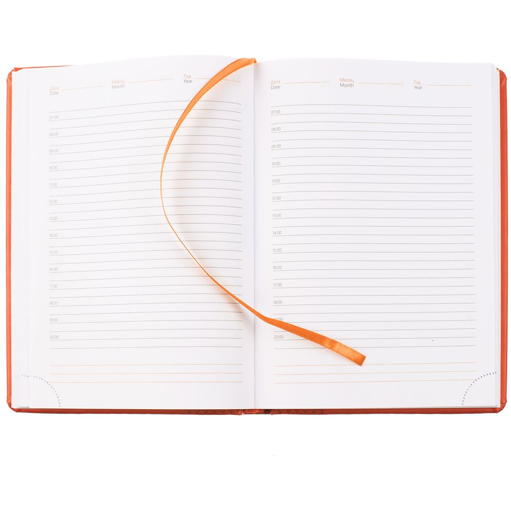 Ежедневник с твердой обложкой, выполнен из материала Waltz, оранжевый ОО, дополнен ляссе в цвет материала.
