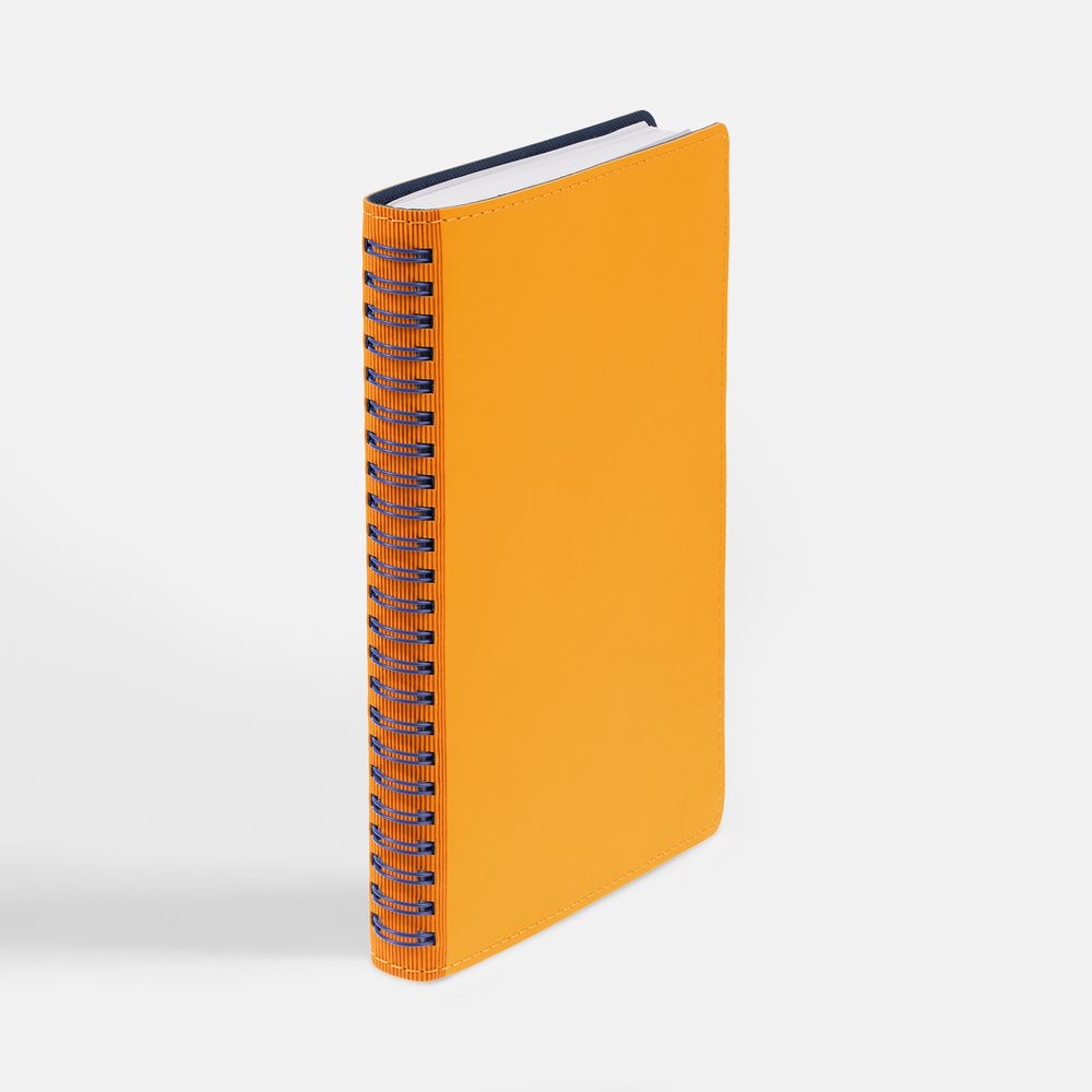 Ежедневник с гибкой обложкой, выполнен из материалов Soft Touch, желтый КК и Nice Touch, темно-синий ХХ.