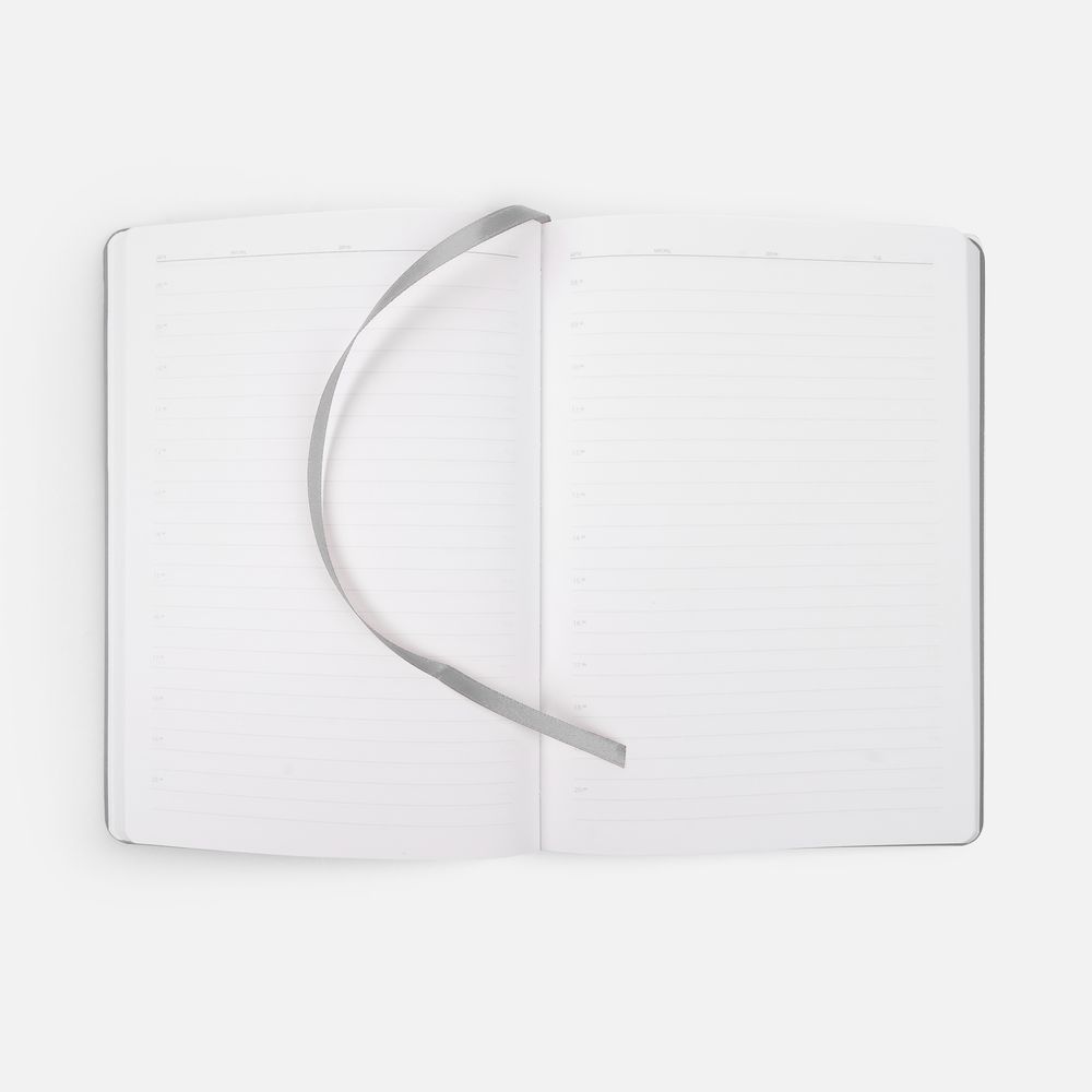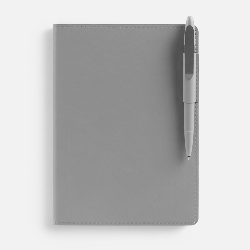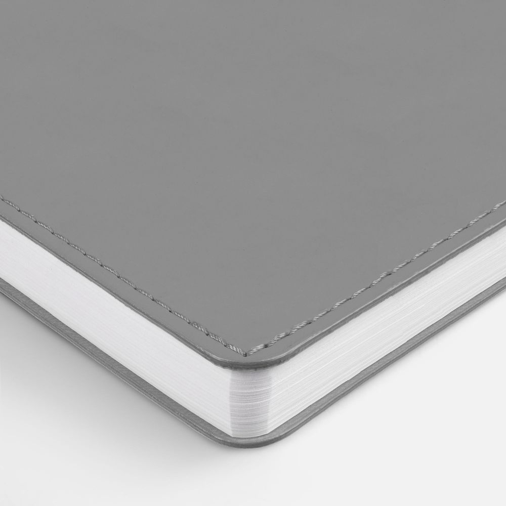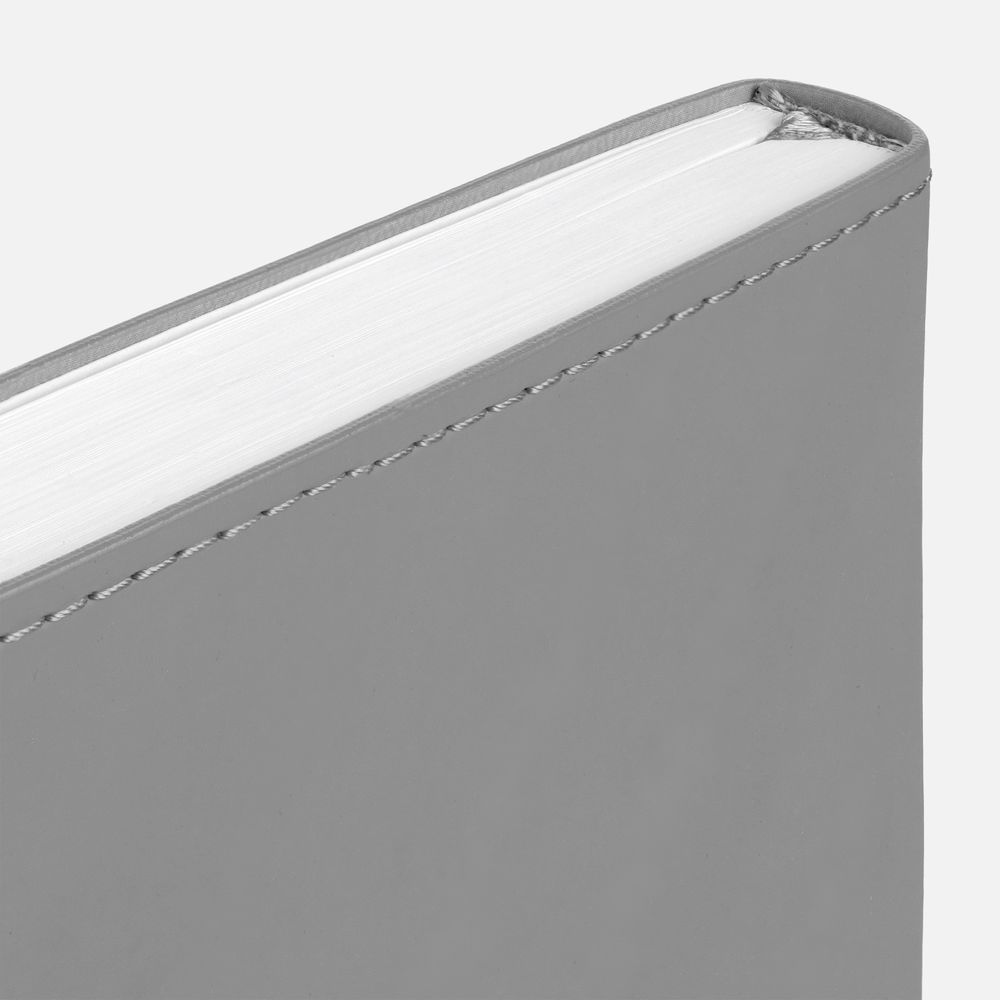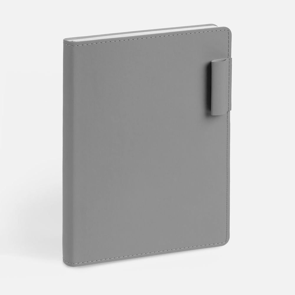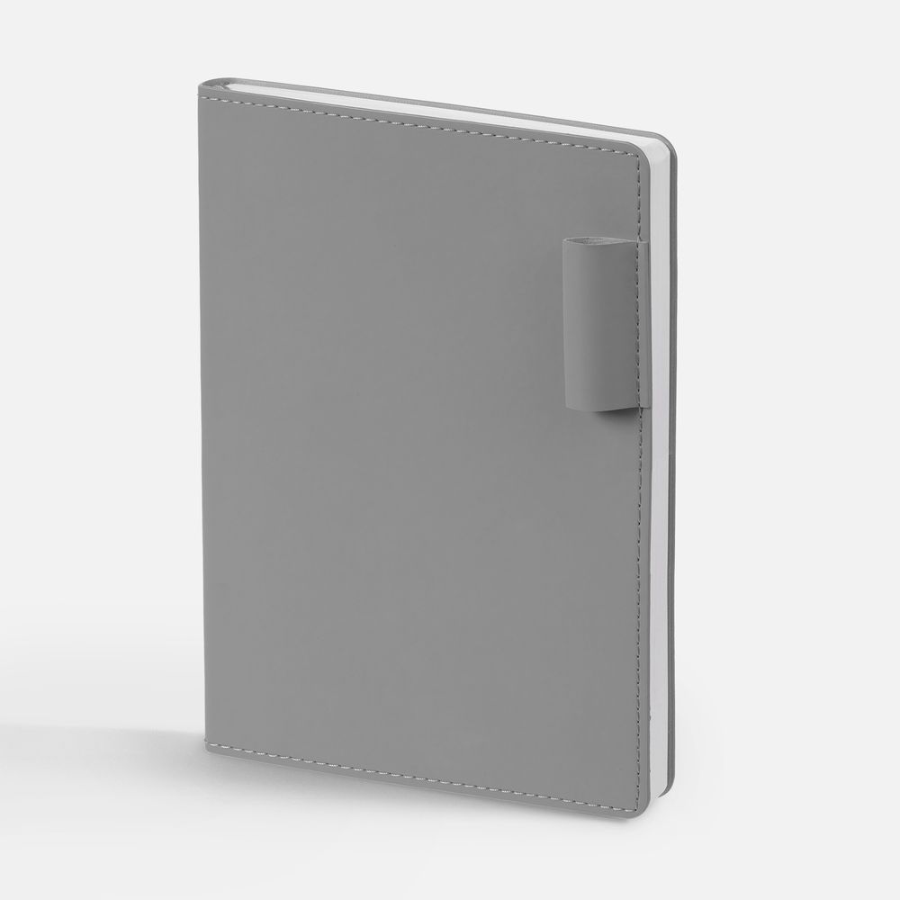Ежедневник с гибкой обложкой из материала Soft Touch, серый СС и Latte, серый (внутренний материал), дополнен петелькой для ручки из покровного материала, капталом, ляссе и закрашенным срезом обложки в цвет материала.Блок 985, без календарной сетки и информационного блока: