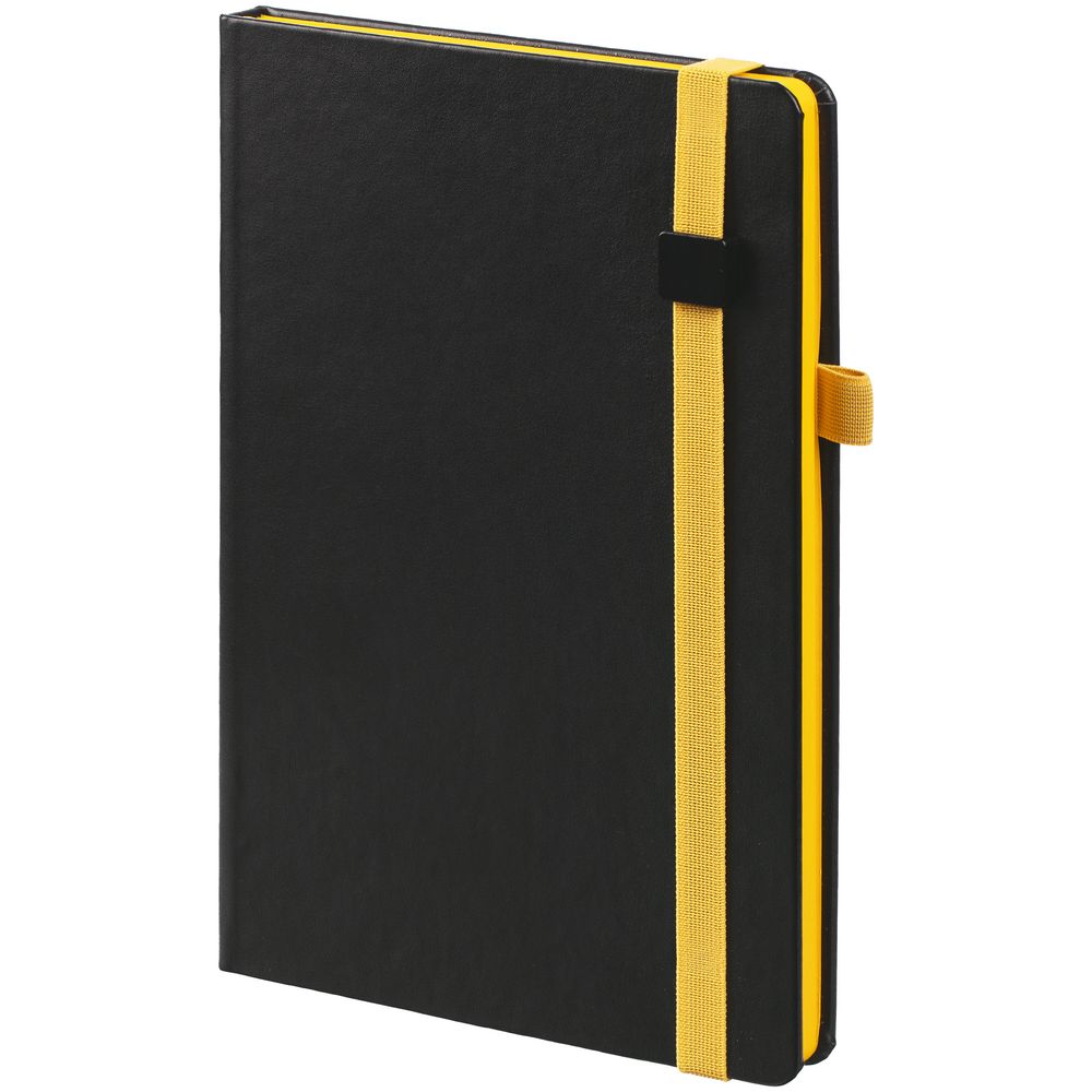 Ежедневник с полутвердой обложкой, выполнен из материала Waltz, черный АА, дополнен зеленой резинкой с металлическим шильдом и ляссе.