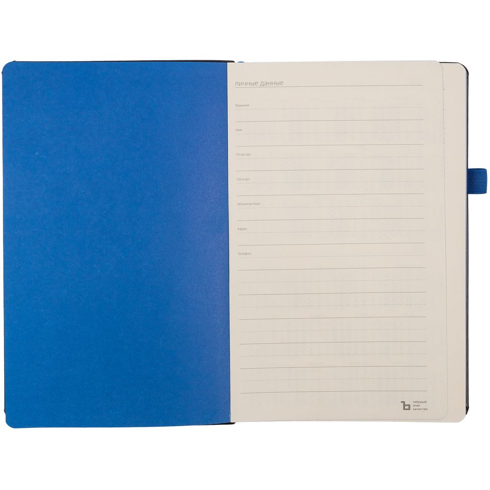 Ежедневник с твердой обложкой, выполнен из материала Waltz, черный АА, дополнен синей резинкой и ляссе.