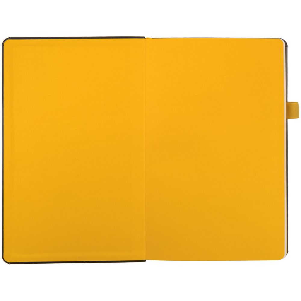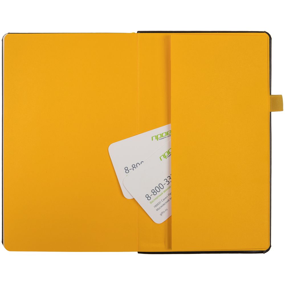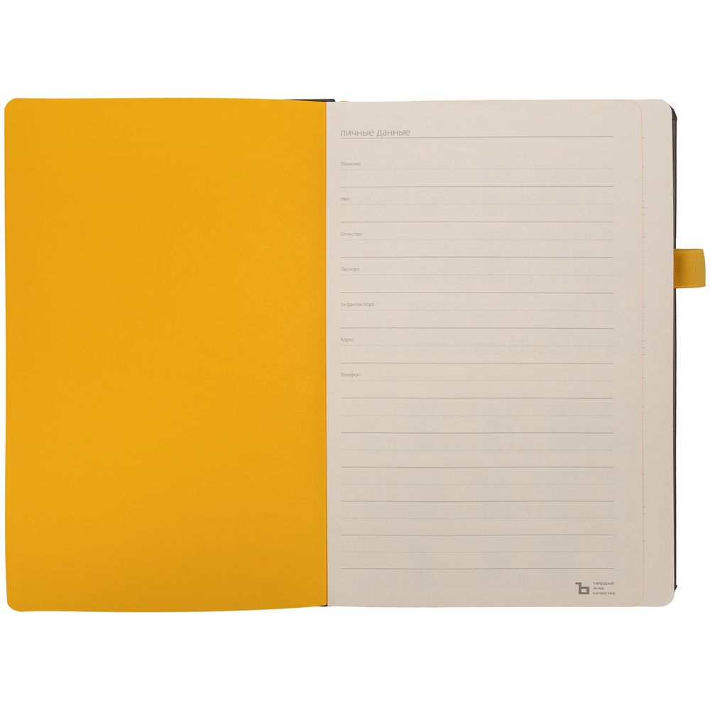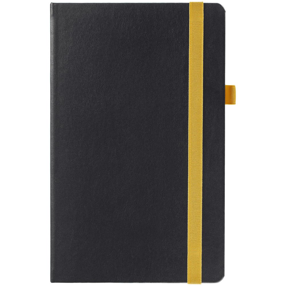 Ежедневник с твердой обложкой, выполнен из материала Waltz, черный АА, дополнен желтой резинкой и ляссе.