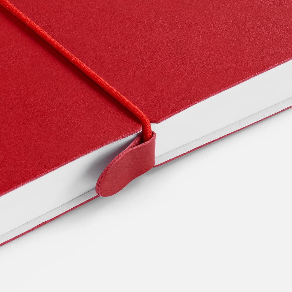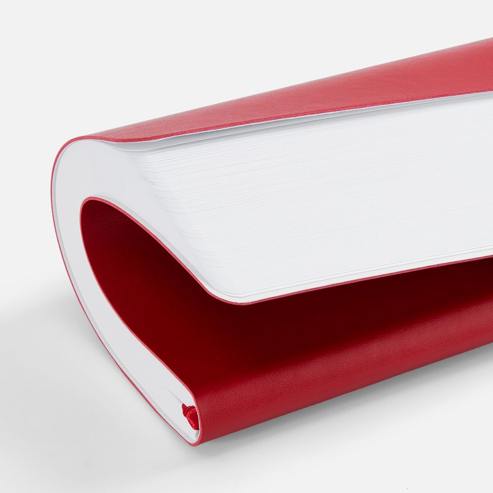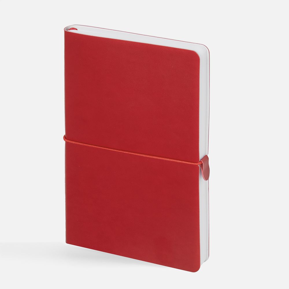 Ежедневник с гибкой обложкой, выполнен из материала Waltz, красный РР, дополнен ляссе в цвет обложки с металлическим шильдом.