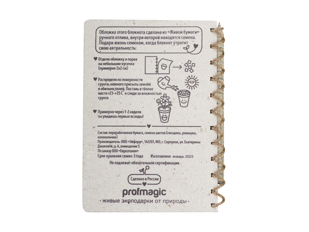 Живой Блокнот - это блокнот ручной работы с семенами цветов внутри обложки. Блок на 50 листов сделан из экологичной неотбеленной бумаги, вместо пружины используется льняной шпагат. Блокнот поставляется с бумажным карандашом в наборе. После использования блокнота, вырвите обложку, порвите ее на кусочки и посадите в землю. Поливайте, и уже через несколько недель вы увидите первые всходы. -