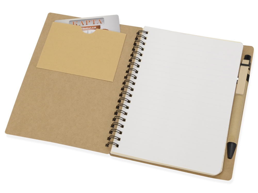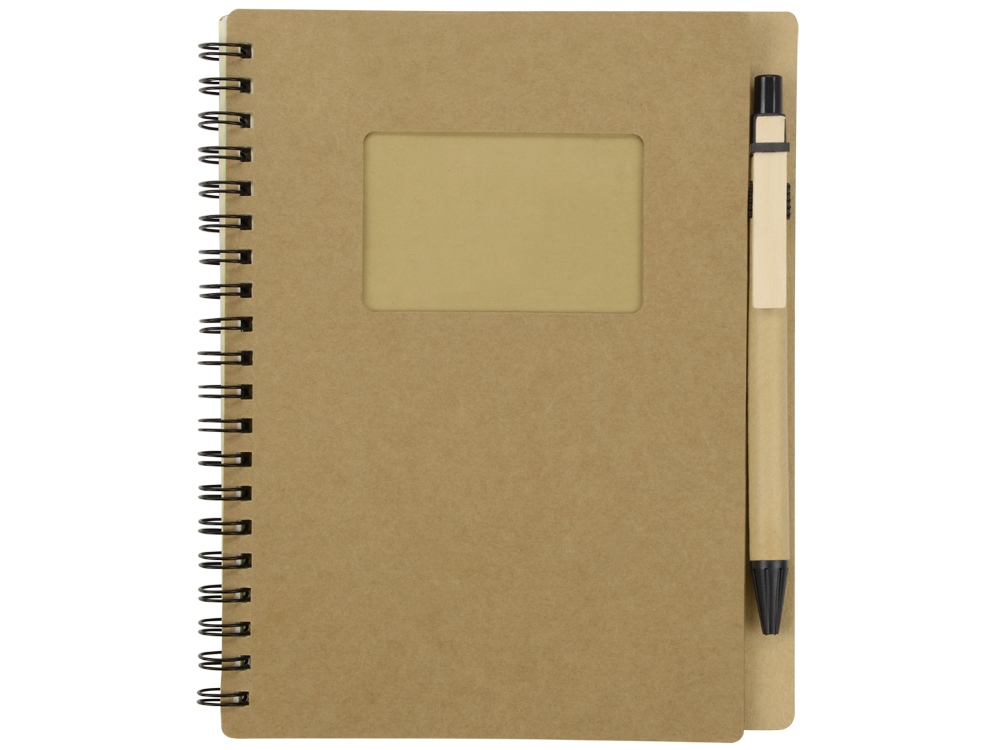 Блокнот Дейзи сделан из бумаги и картона и переплетен на пружине. В обложке блокнота предусмотрено окошко 8,3 х 4,7 см, в которое можно поместить визитную карточку или полиграфическую вставку размером 9 х 5,8 см.