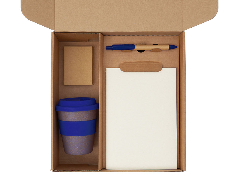 блокнот- бумага из переработанных тетра-паков, ручка- картон, пластик, стакан- 50% бамбуковое волокно, 50% полипропилен, коробка- картон