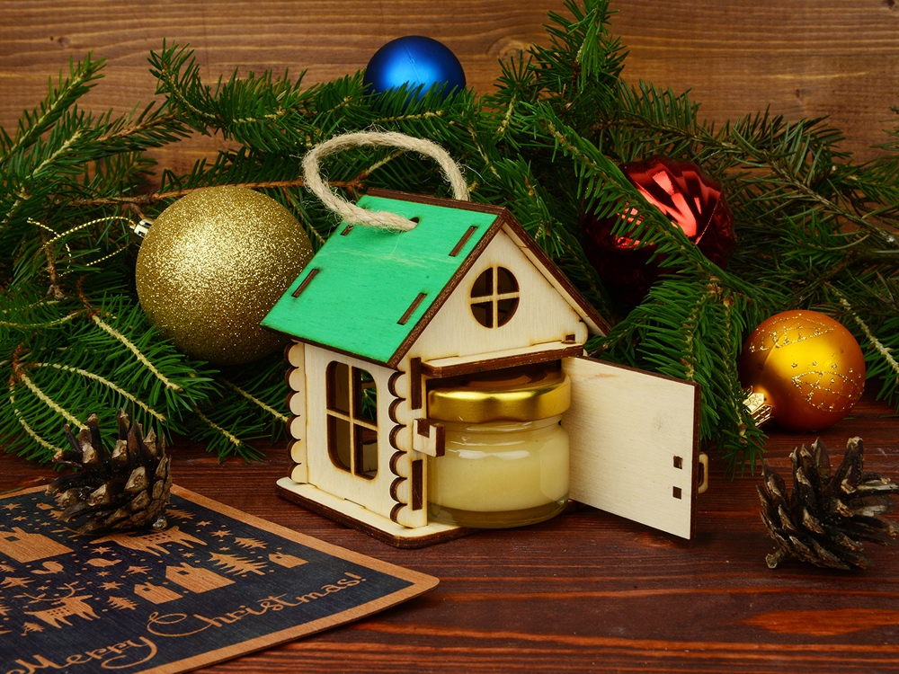 Подарочная упаковка Домик выполнена в виде игрушки, которую легко можно поставить на стол, шкаф или повесить на стену. Ее также можно использовать, как елочное украшение или новогодний подарок. Она изготовлена из экологически чистых материалов и обладает чарующим древесным ароматом. В домике открывается дверца, и в него можно поместить небольшую баночку с медом или вареньем. Яркие цвета крыши домиков и эффектная конструкция помогут украсить любой интерьер, как в офисе, так и в квартире. Подарочная упаковка Домик” позволит вам сделать оригинальный и запоминающийся подарок для руководителя или коллеги. -