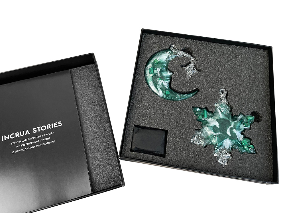 Набор из 2-х елочных игрушек: в форме месяца и снежинки. Игрушки выполнены из ювелирной эпоксидной смолы и украшены галтовкой из натуральных минералов.