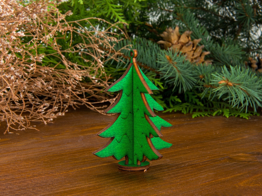 Елочная экоигрушка в виде главного новогоднего дерева – атмосферный и праздничный сувенир. Елочка изготовлена из березовой фанеры и тонирована в зелёный цвет. Этот небольшой новогодний презент отлично укладывается в концепцию экоподарка, при производстве и тонировании используются натуральные материалы и красители. -
