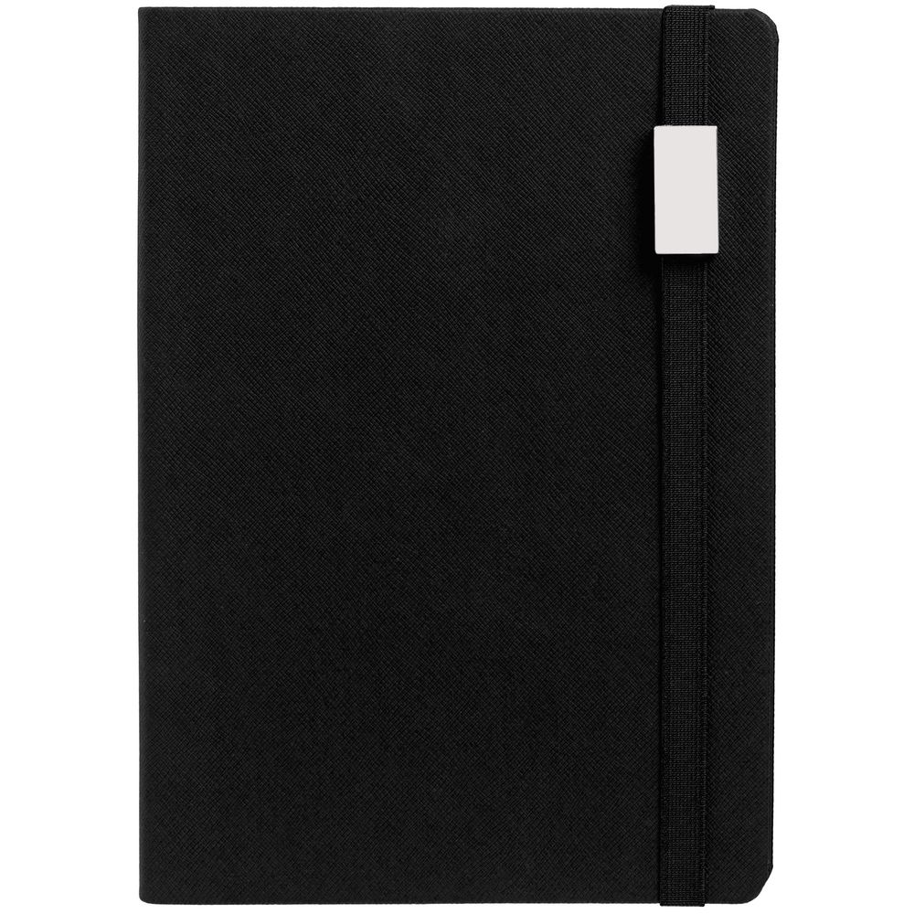 Ежедневник с полутвердой обложкой выполнен из материала Nice Touch, черный АА, и дополнен резинкой шириной 1 см с металлическим шильдом и ляссе черного цвета.