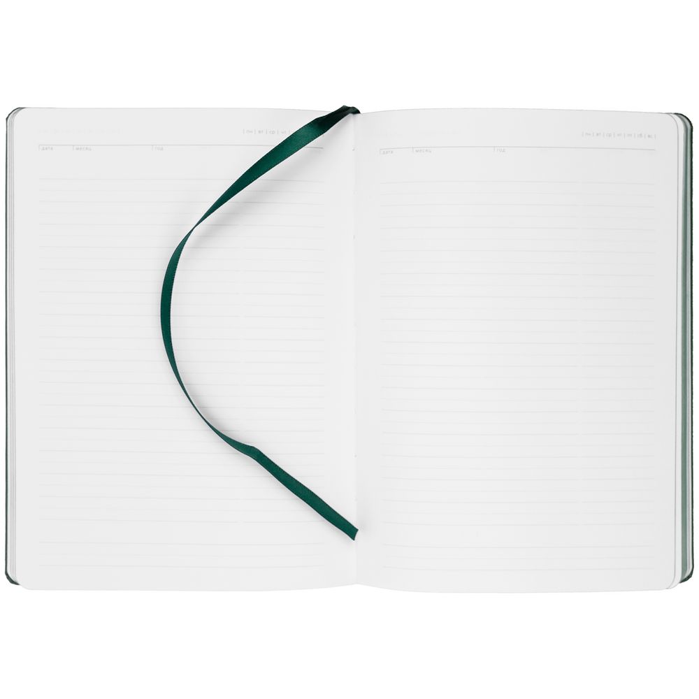 Ежедневник с твердой обложкой. Выполнен из материала Latte, зеленый, дополнен ляссе в цвет обложки.