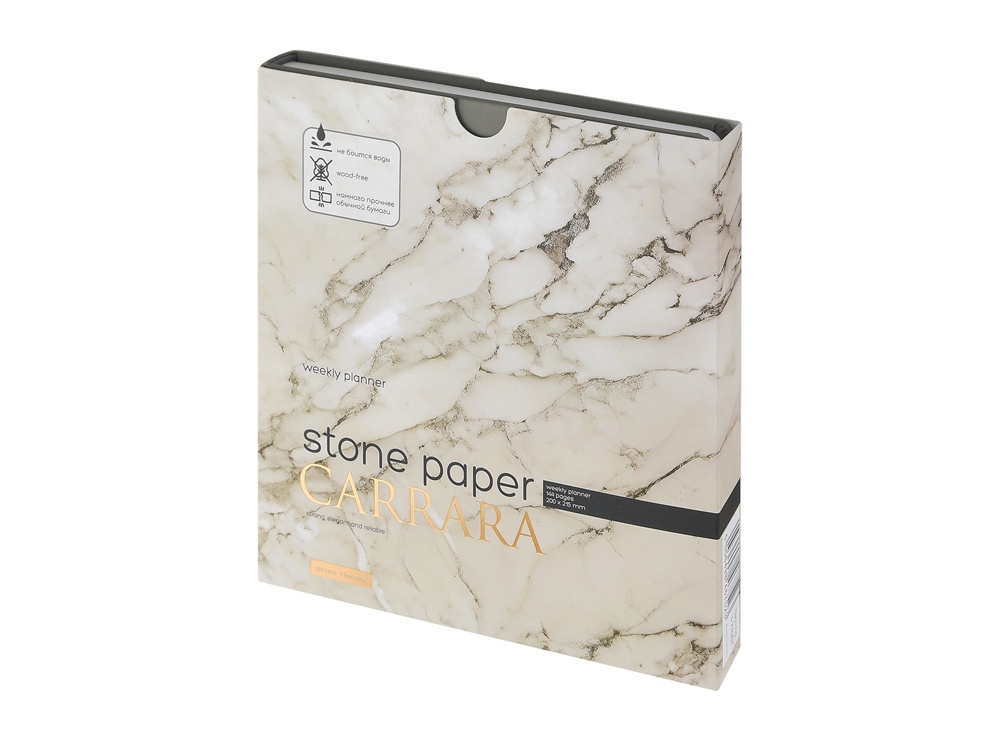 Блок произведен из каменной бумаги плотностью 144 г/кв.м, отличающейся особой гладкостью и повышенной прочностью. Она не боится воды и пролитого кофе, достаточно просто протереть сухой салфеткой.