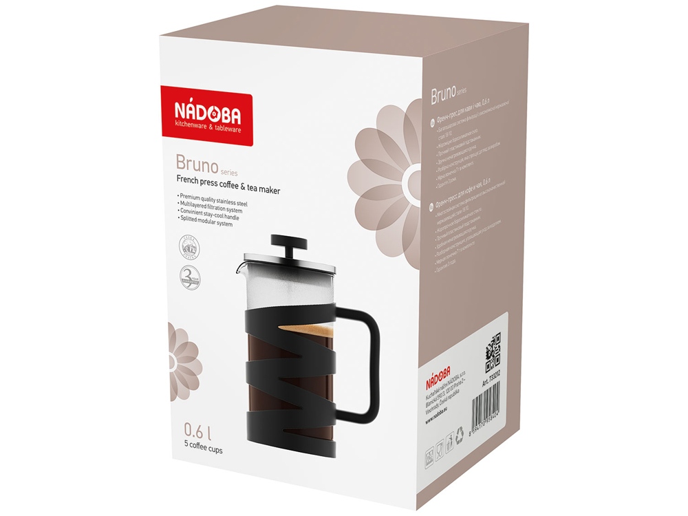 Френч-прессы серии Bruno имеют колбу, выполненную из жаропрочного боросиликатного стекла. Прочный подстаканник из высококачественного пластика обеспечивает дополнительную термоизоляцию и предохраняет колбу от повреждений. Многослойная система фильтрации френч-прессов выполнена из высококачественной нержавеющей стали 18/10. Удобная ручка не нагревается и не выскальзывает из рук. Разборная конструкция изделий и системы фильтрации облегчают легкий и качественный уход. В комплекте предусмотрена мерная ложка 7г для точной дозировки продуктов. В серию входят френч-прессы объёмом 0,8 и 0,6 л. Гарантия на френч-прессы серии Bruno 3 года. -
