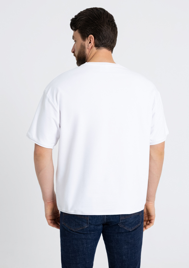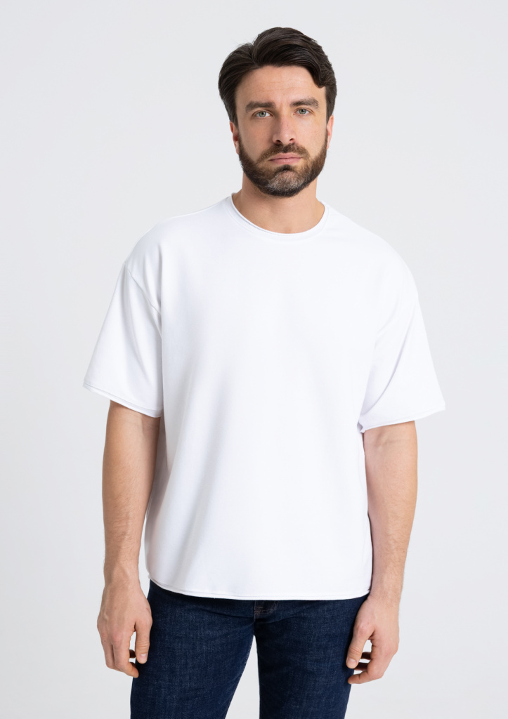 Футболка оверсайз-силуэта со спущенной линией плеча и необработанным краем рукава, горловины и по низу изделия.