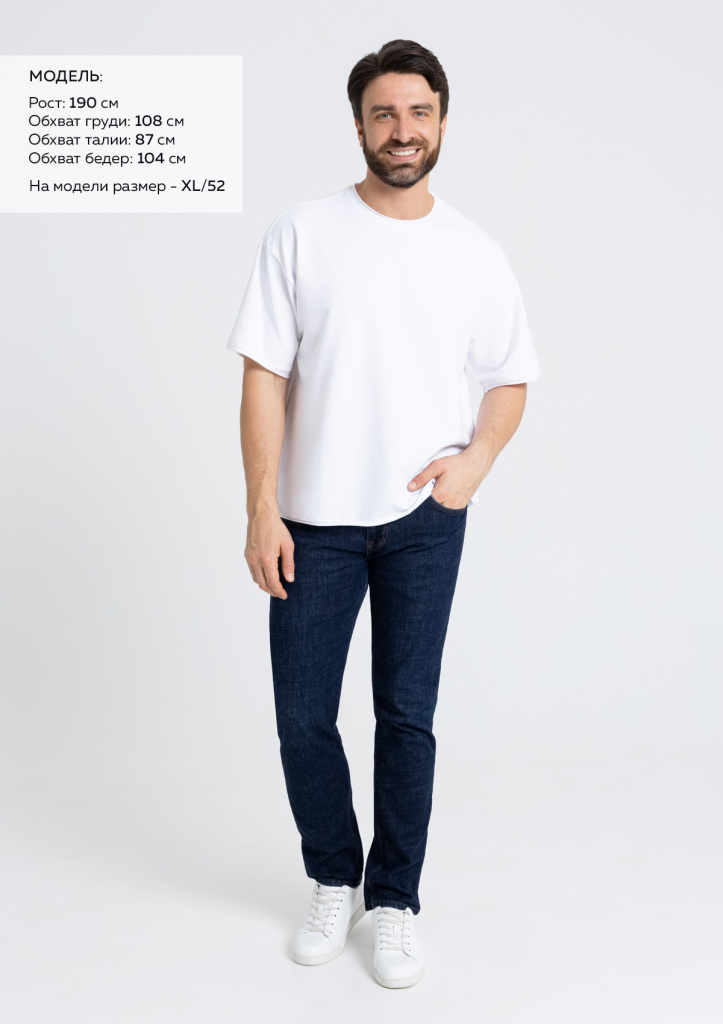 Размер мужской футболки: XL/52. Параметры модели: рост 190 см.; обхват груди 108 см.; обхват талии 87 см.; обхват бедер 104 см.