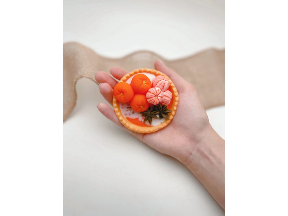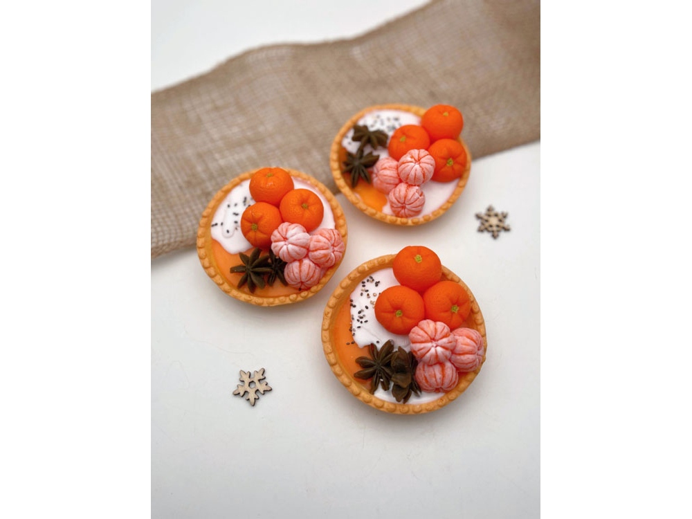 Уникальное мыло ручной работы в форме большой тарталетки с мандаринами. Основные ноты аромата на основе мандаринового-цитрусового микса.