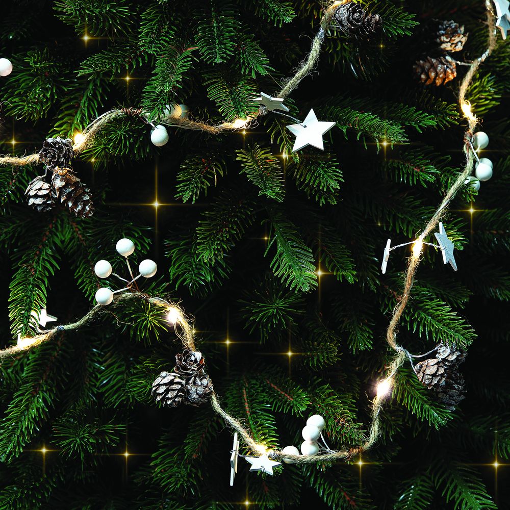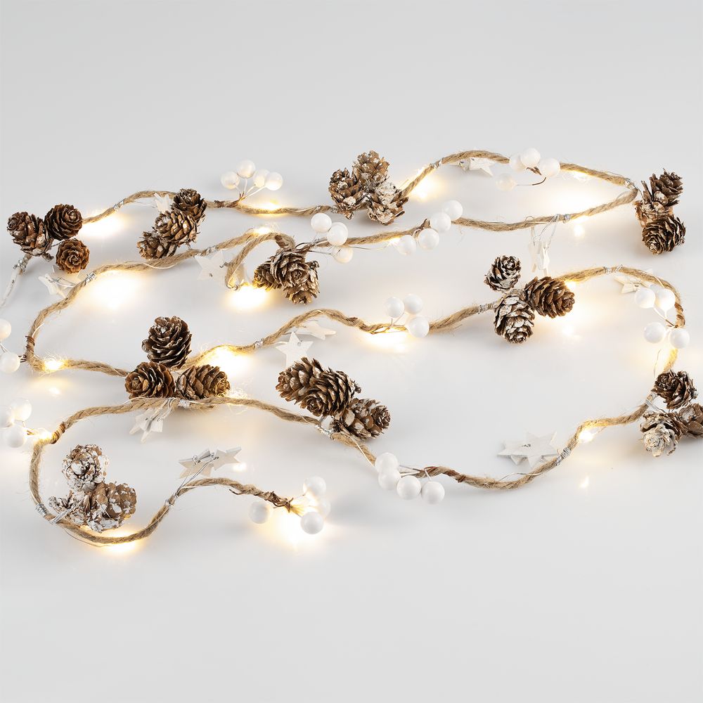 Шишки, бусины, звездочки и 20 лампочек с теплым светом. Работает от 3 батареек АА (в комплект не входят). -