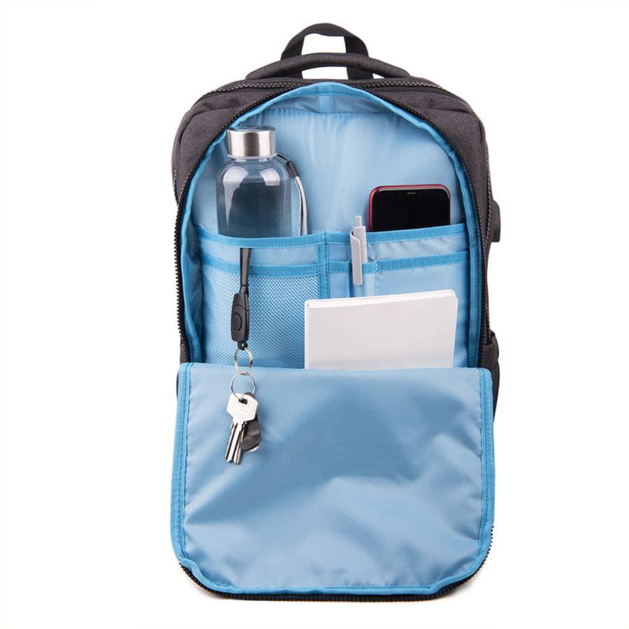 Стильный и функциональный рюкзак из коллекции COREПодходит для ноутбука до 15,6 дюймовГолубой подклад из нейлона, цвет близкий к PANTONE 292 CЦвет основного материала близкий к PANTONE 7540 CОсновное отделение с плотной эргономичной спинкой, дополнительным разделителем, с карманом с RFID защитой для размещения самых ценных предметов и встроенным USB Внешнее отделение с мелкими кармашками для мелочей и держателем для ключей со съёмным колечком и светоотражающей детальюНебольшой внешний карман на лицевой стороне в нижней части на молнии со стильнымпластиково-металическим пуллеромБоковые карманы для бутылки или зонта с эластичной регулировкой шириныМягкие эргономичные лямки со светоотражающими элементами, креплением для очков и регулированием по длинеДеталь на спинке для крепления на ручку чемоданаОсновные отделения с двухзамковой тракторной молниейи матовыми металлическими пуллерами Back FlyФирменная декоративная прострочкаПыльник для хранения в комплекте, индивидуальная упаковка в прозрачную плёнку -
