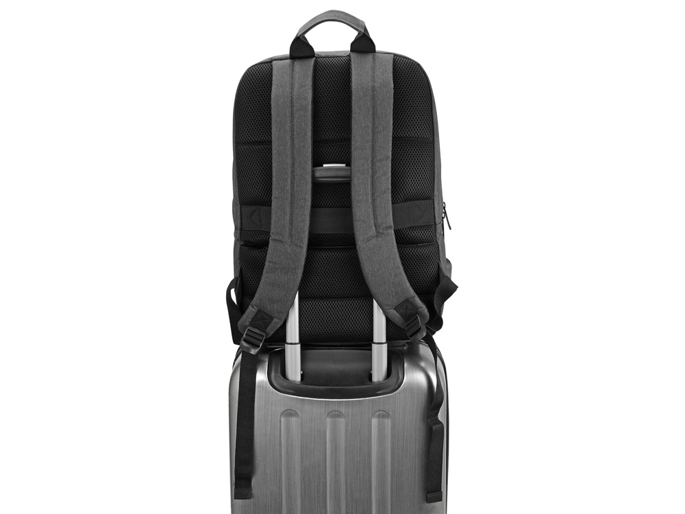• Ремень на задней спинке рюкзака для надежной фиксации аксессуара на телескопической ручке чемодана или сумки на колесиках.