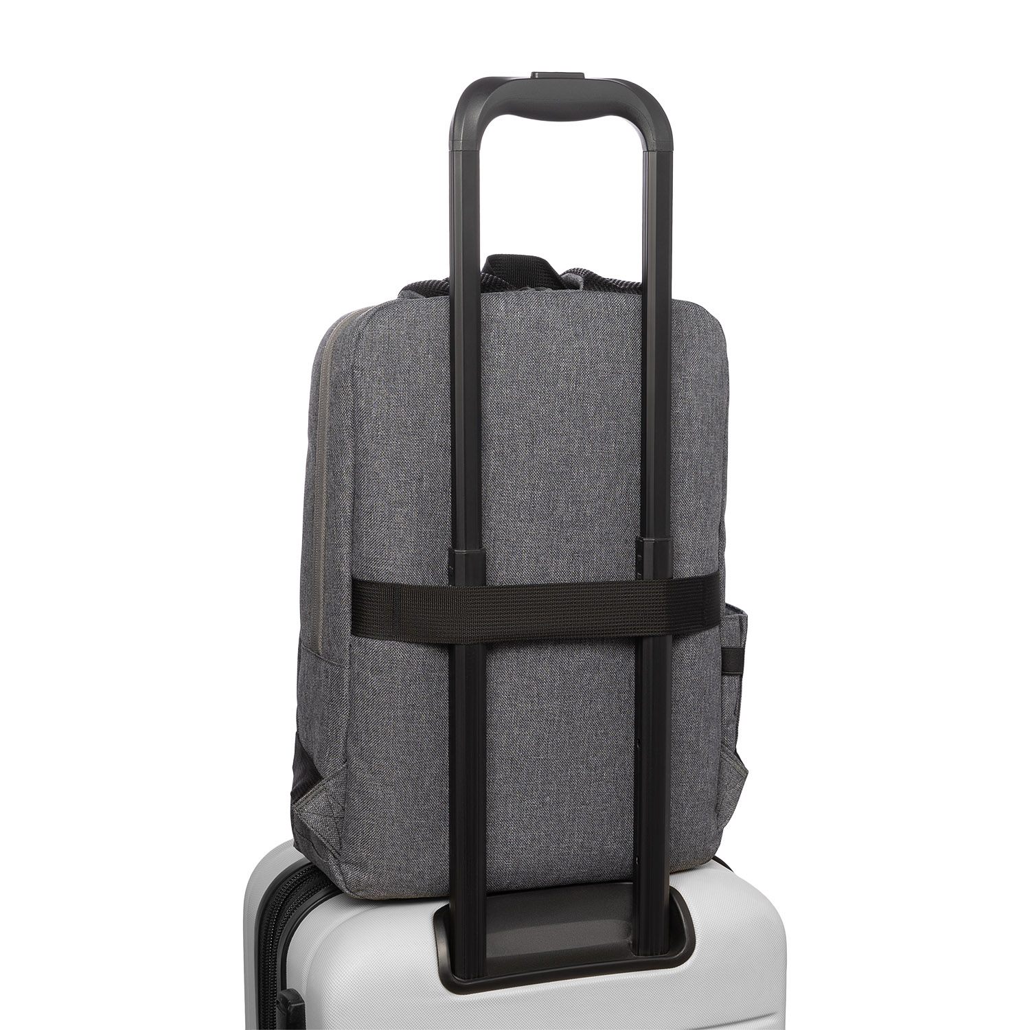 С одной стороны рюкзака также располагается внешний карман – для зонта или бутылки с водой. На спинке лента для фиксации на ручке дорожного чемодана.