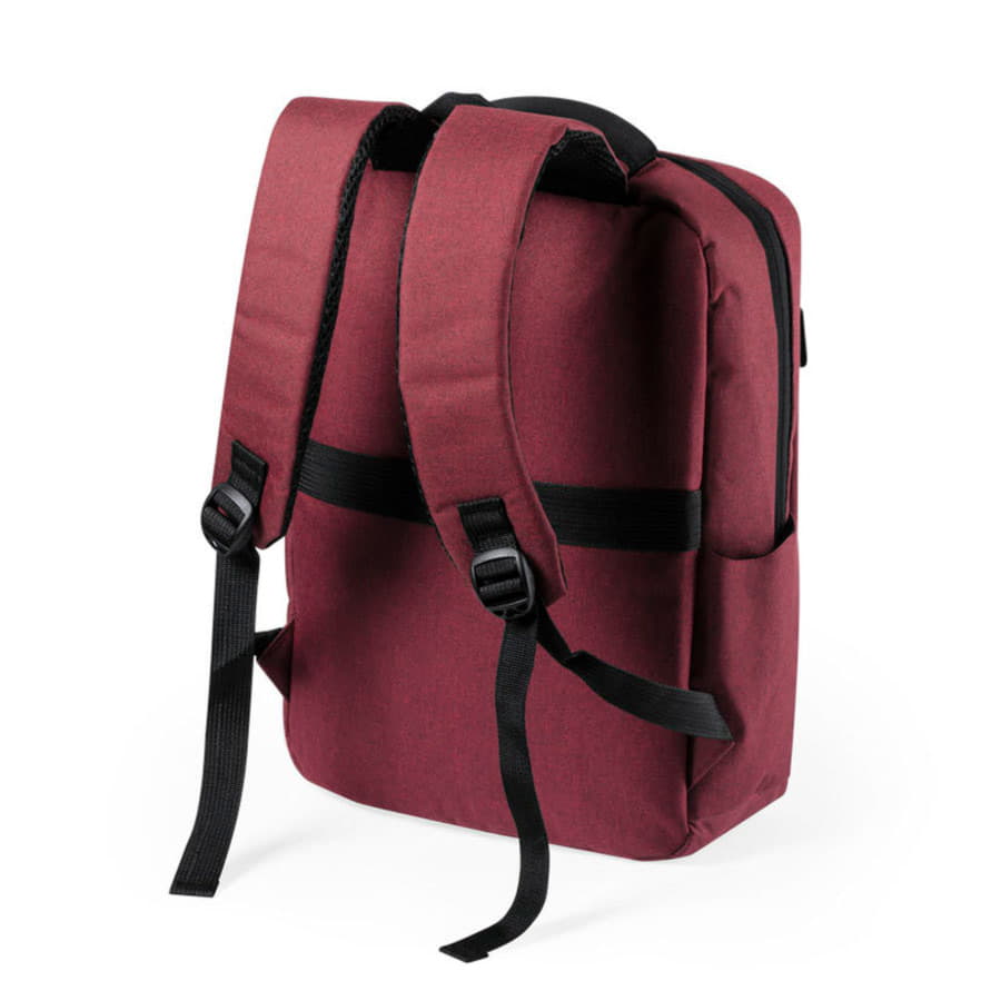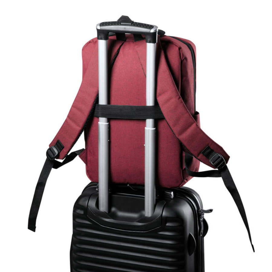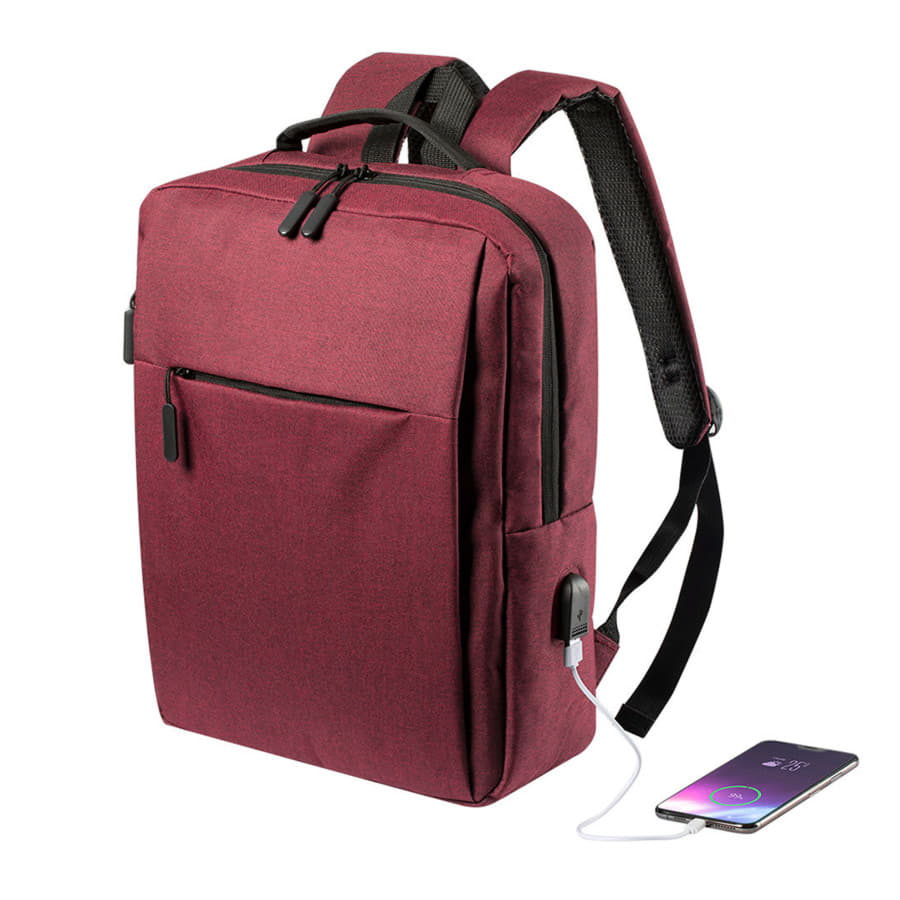 Повседневный рюкзак стиля casual выполнен из плотного 600 D полиэстера. · Объём: 16 литров · Вмещает ноутбук 15" Описание: · Прочный и водоотталкивающий материал · Основной отдел на молнии с двумя бегунками для удобства открытия · 2 удобных наружных кармана на передней части рюкзака · Внутри укрепленный отдел для ноутбука с защитной тесьмой на липучке · USB разъем для подзарядки вашего устройства (внутри рюкзака расположен кабель для соединения с power bank) · Специальная стропа на спинке для крепления рюкзака на выдвижную ручку чемодана · Эргономичные лямки и ручка рюкзака · Лямки прошиты дополнительными стропами в быстро изнашиваемых местах, которые можно отрегулировать по длине и зафиксировать пластиковыми крепежамиЦвет близкий к пантону 7421 С. · Упаковка: прозрачный пакет -