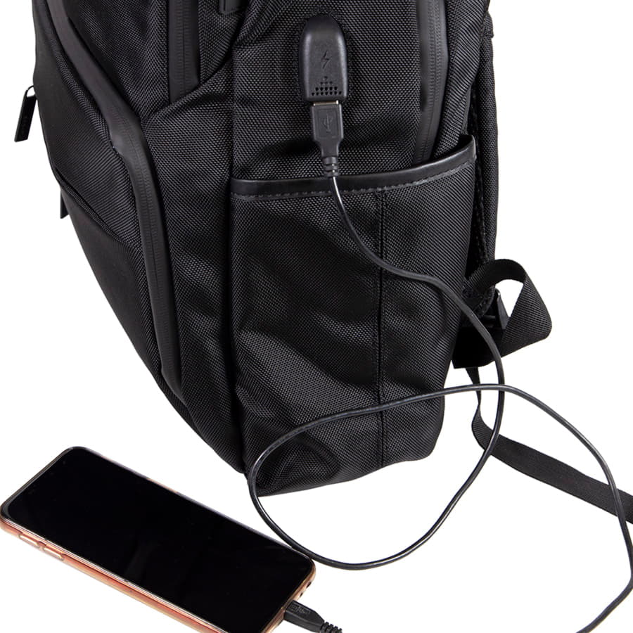 Основная ткань: цвет, близкий к Pantone Black C. · Основная ткань: 100% полиэстер, подкладка: 100% полиэстер · Объём: 19 литров · Вмещает ноутбук 15,6" Описание: · Сочетание основного прочного водоотталкивающего материала и яркой контрастной подкладки · Водонепроницаемые молнии с лазерным кроем · Три дополнительных внешних кармана на молнии · Два боковых кармана · Внутри укрепленный отдел для ноутбука · Специальный RFID карман с системой защиты от несанкционированного считывания персональных данных · Внутренние карманы-сетки и карман-органайзер для дополнительного хранения · USB порт для подзарядки вашего устройства (внутри рюкзака расположен кабель для соединения с power bank) · Силиконовая нашивка для проводов от наушников · Специальная стропа на спинке для крепления на выдвижной ручке чемодана · Эргономичная спинка и лямки рюкзака из вентилируемого материала · Укрепленная ручка рюкзака · Карманы для проездных карт на лямке рюкзака · Светоотражатели на лямках рюкзака для обеспечения безопасности · Лямки прошиты дополнительными стропами в быстро изнашиваемых местах, которые можно отрегулировать по длине и зафиксировать пластиковыми крепежами · Брендированные металлические пуллеры Bag Fly · Жаккардовый логотип Bag Fly внутри · Картонный ярлык Bag Fly · Внутрь рюкзака вложена сумка из нетканого материала для хранения · Упаковка: прозрачный пакет -